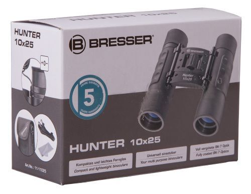 Bresser Hunter – одна из самых популярных серий биноклей немецкого бренда Брессер. Это недорогие модели с хорошей оптикой для ежедневного ношения или частых прогулок. Каждая модель обеспечена десятилетней гарантией.