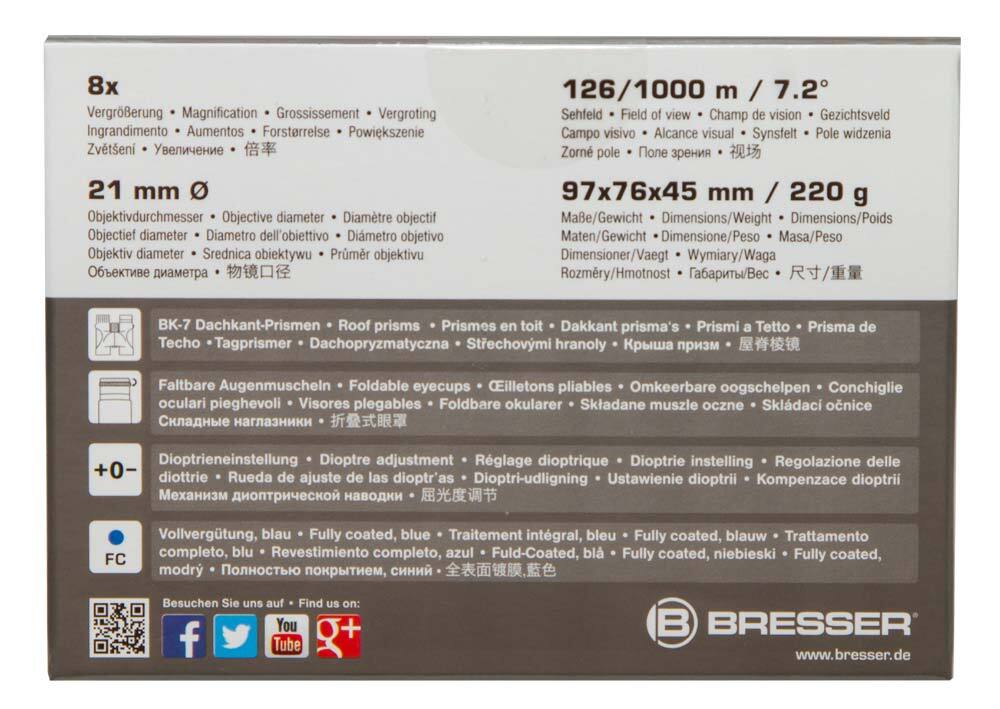 В Bresser Travel 8x21 установлены современные roof-призмы и линзы с полным просветлением. Оптика не искажает геометрию предметов и радует яркой и контрастной картинкой. Все детали удаленных объектов видны четко и подробно. Корпус бинокля покрыт резиной и отталкивает пыль и грязь. Благодаря ему оптика надежно защищена от случайных ударов.