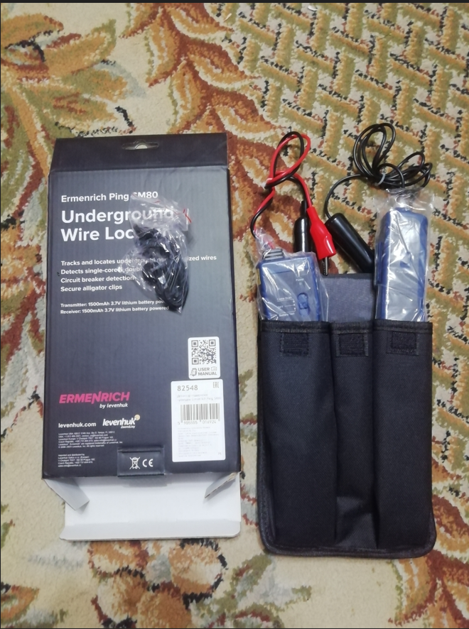 У детектора нет дисплея, управление осуществляется с помощью переключателей и кнопок на передатчике и приемнике. Детектор Ermenrich Ping SM80 работает с кабелями длиной до 800 м. При обнаружении объекта звучит тоновый сигнал. Для работы при сильном шуме сигнал можно не услышать, поэтому в комплекте предусмотрены наушники. Аудиоразъем 3,5 мм для наушников расположен на приемнике. Для питания используются литиевые аккумуляторы емкостью 1500 мАч с зарядкой через кабель microUSB (входит в комплект поставки). Время работы АКБ без подзарядки – примерно 4 часа.