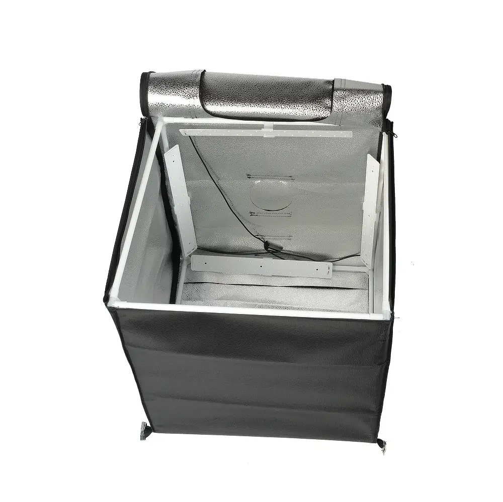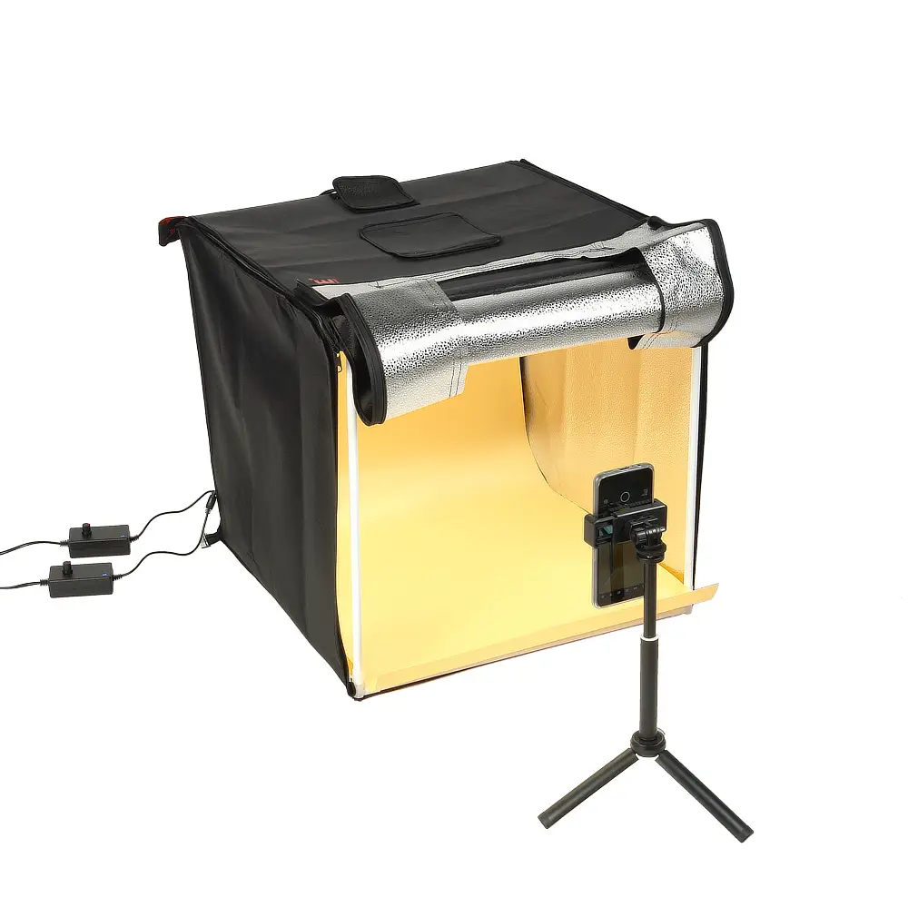 Основой фотобокса служит тент, который натягивается на жесткий сборный каркас из трубок, соединенных между собой пластиковыми уголками. Объект, помещенный в фотобокс, освещается равномерно благодаря серебристой светоотражающей ткани тента и источникам света в самом фотобоксе. Освещение с цветовой температурой 5600 (±200) К обеспечивают 96 светодиодов: 4 планки по 24 источника крепятся к каркасу фотобокса фиксаторами.
