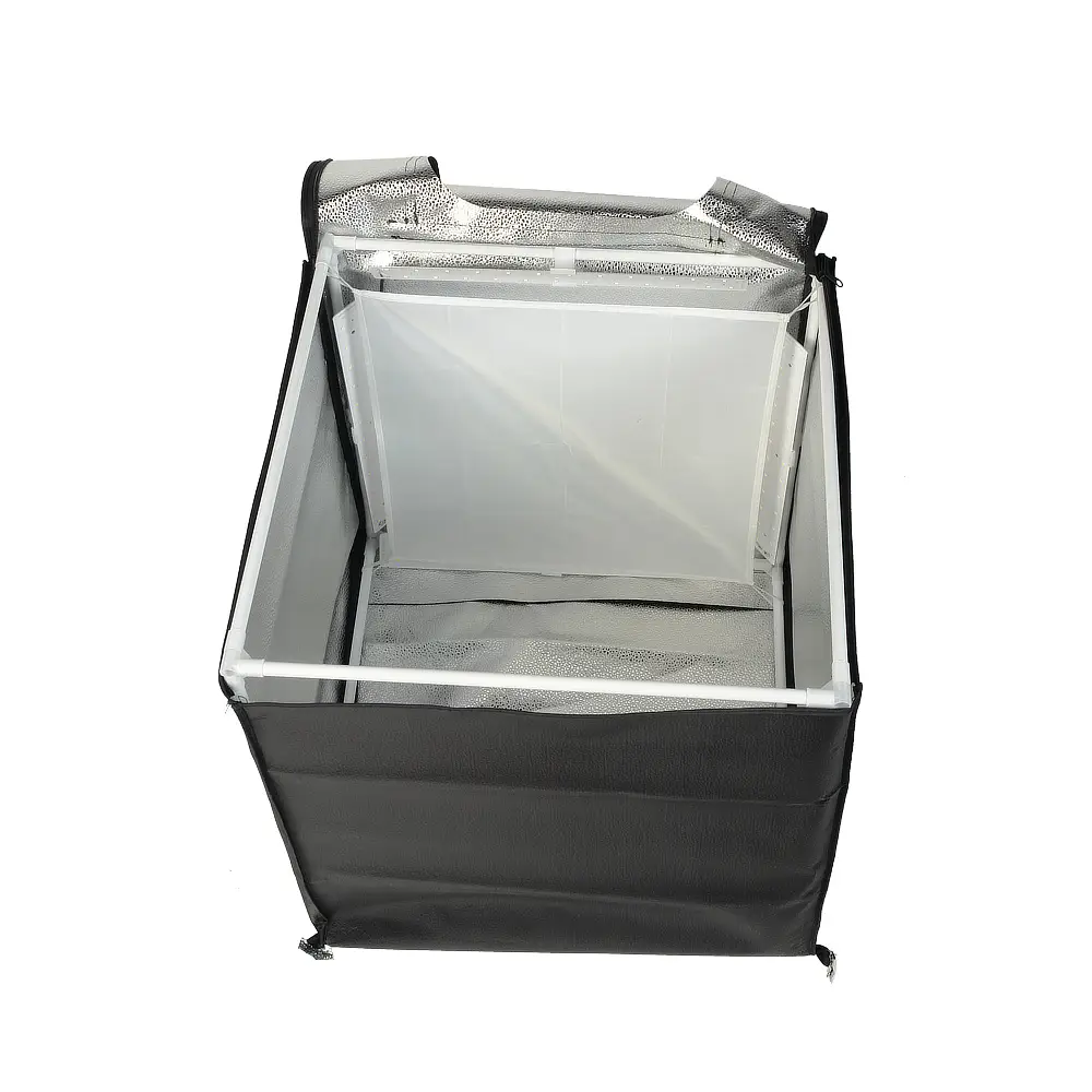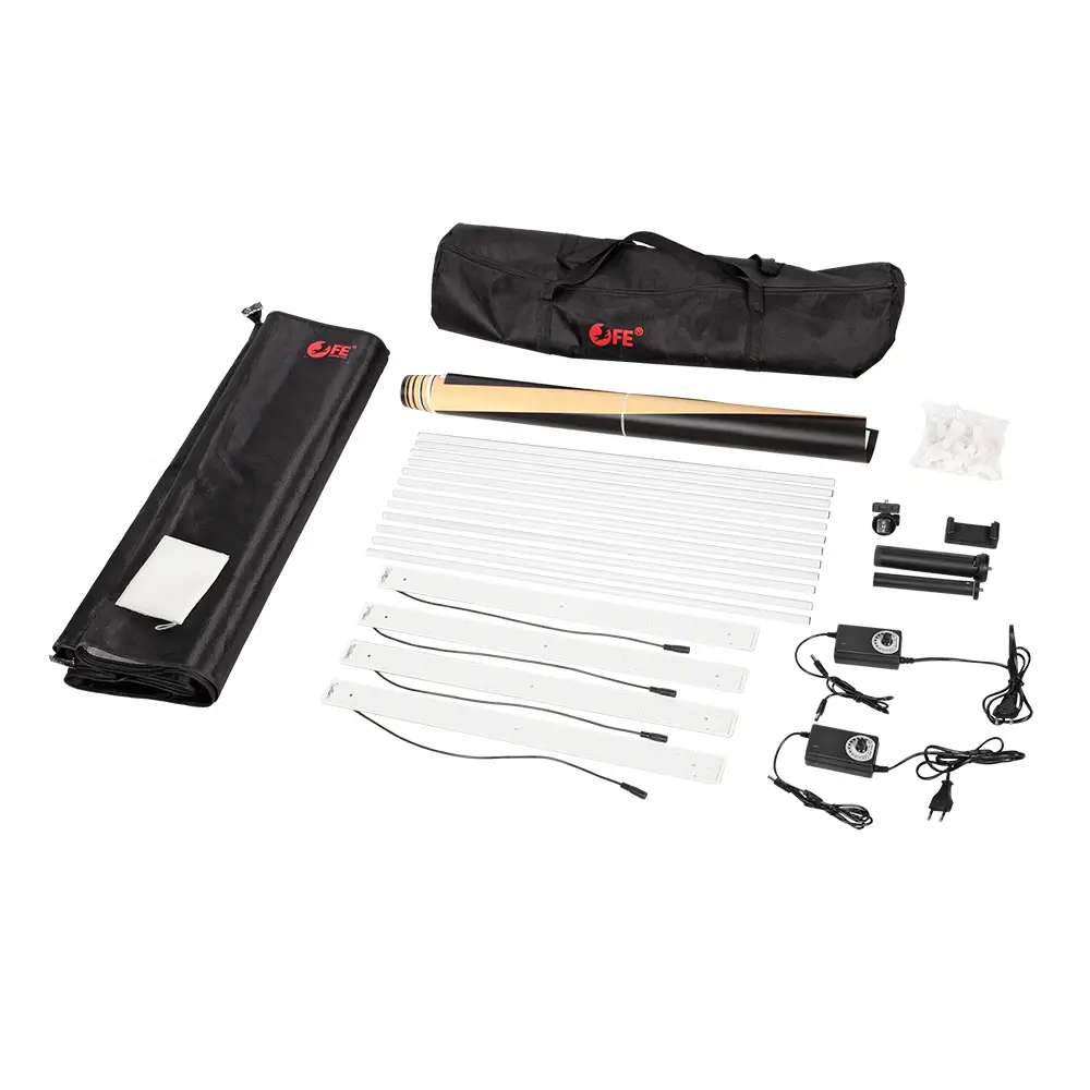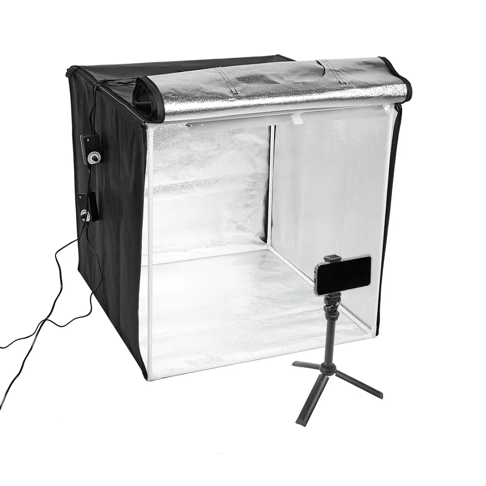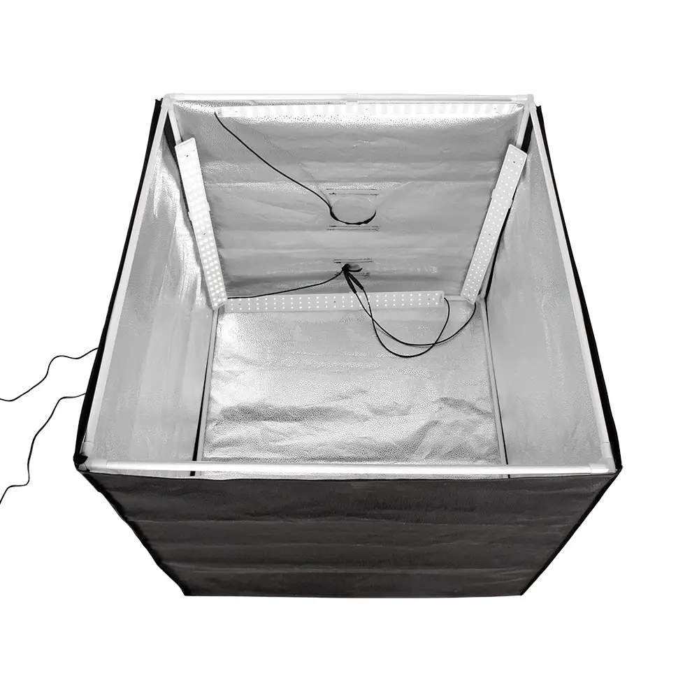 Основой фотобокса служит тент, который натягивается на жесткий сборный каркас из трубок, соединенных между собой пластиковыми уголками. Объект, помещенный в фотобокс, освещается равномерно благодаря серебристой светоотражающей ткани тента и источникам света в самом фотобоксе. Освещение с цветовой температурой 5600 (±200) К обеспечивают 288 светодиодов: 4 планки по 72 источника крепятся к каркасу фотобокса фиксаторами.