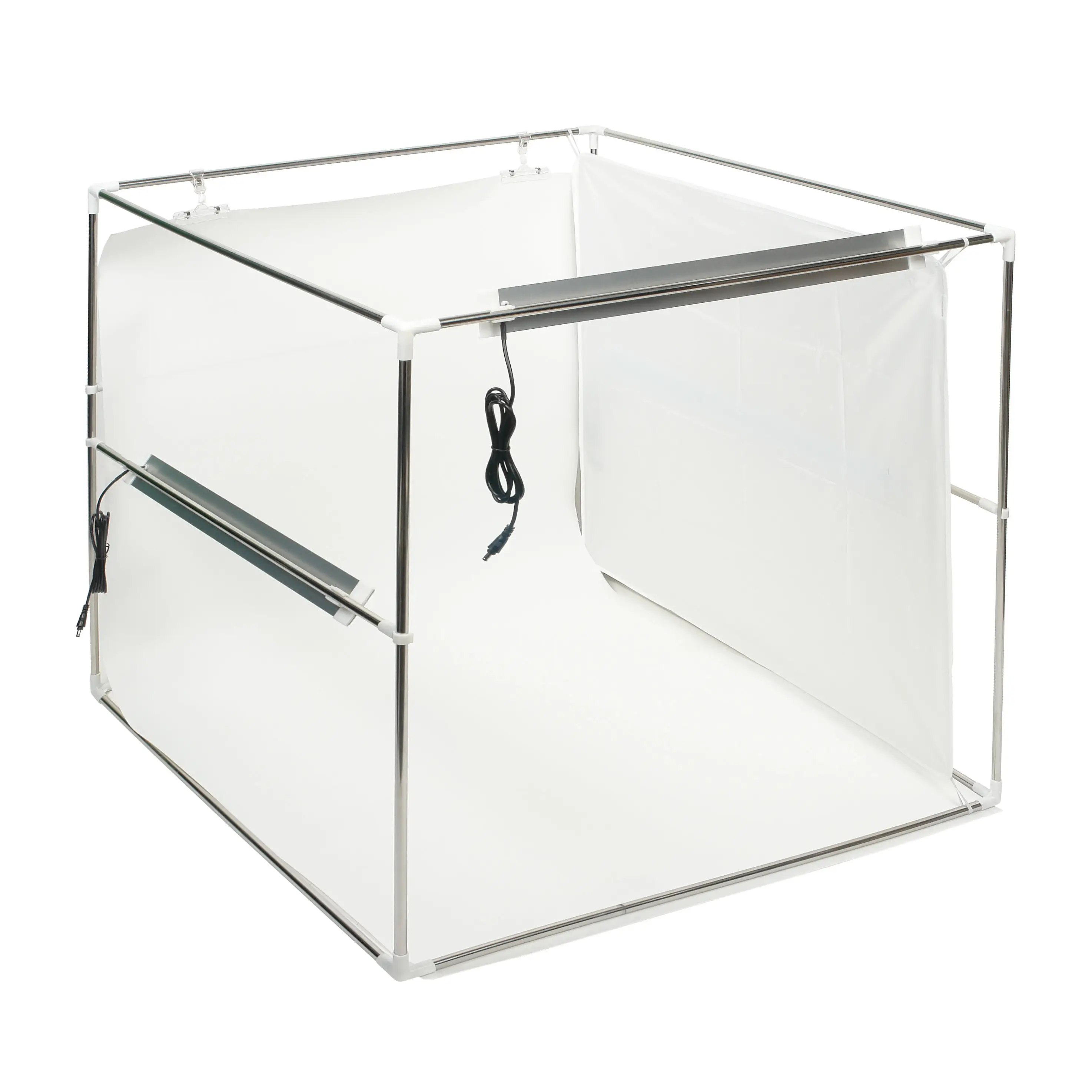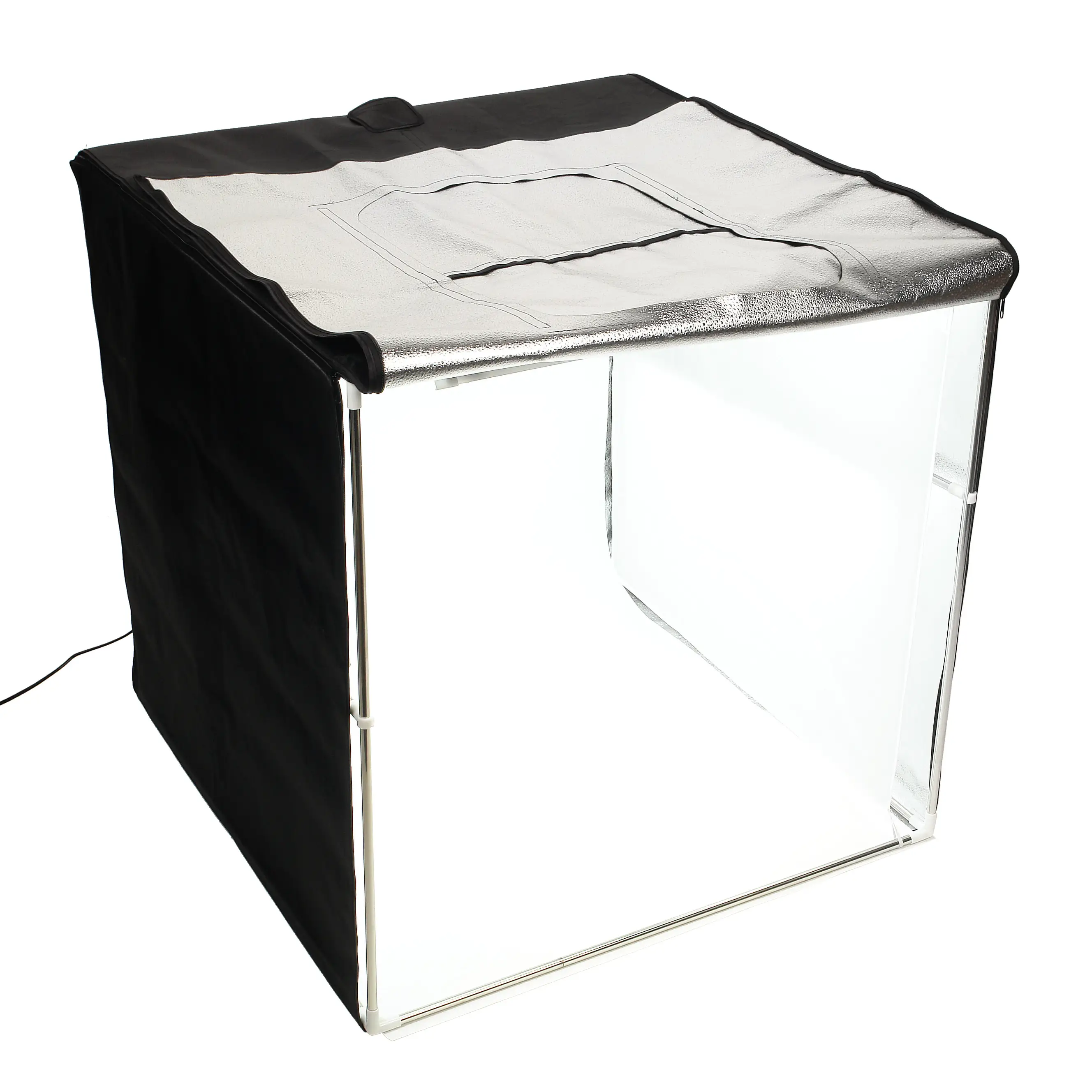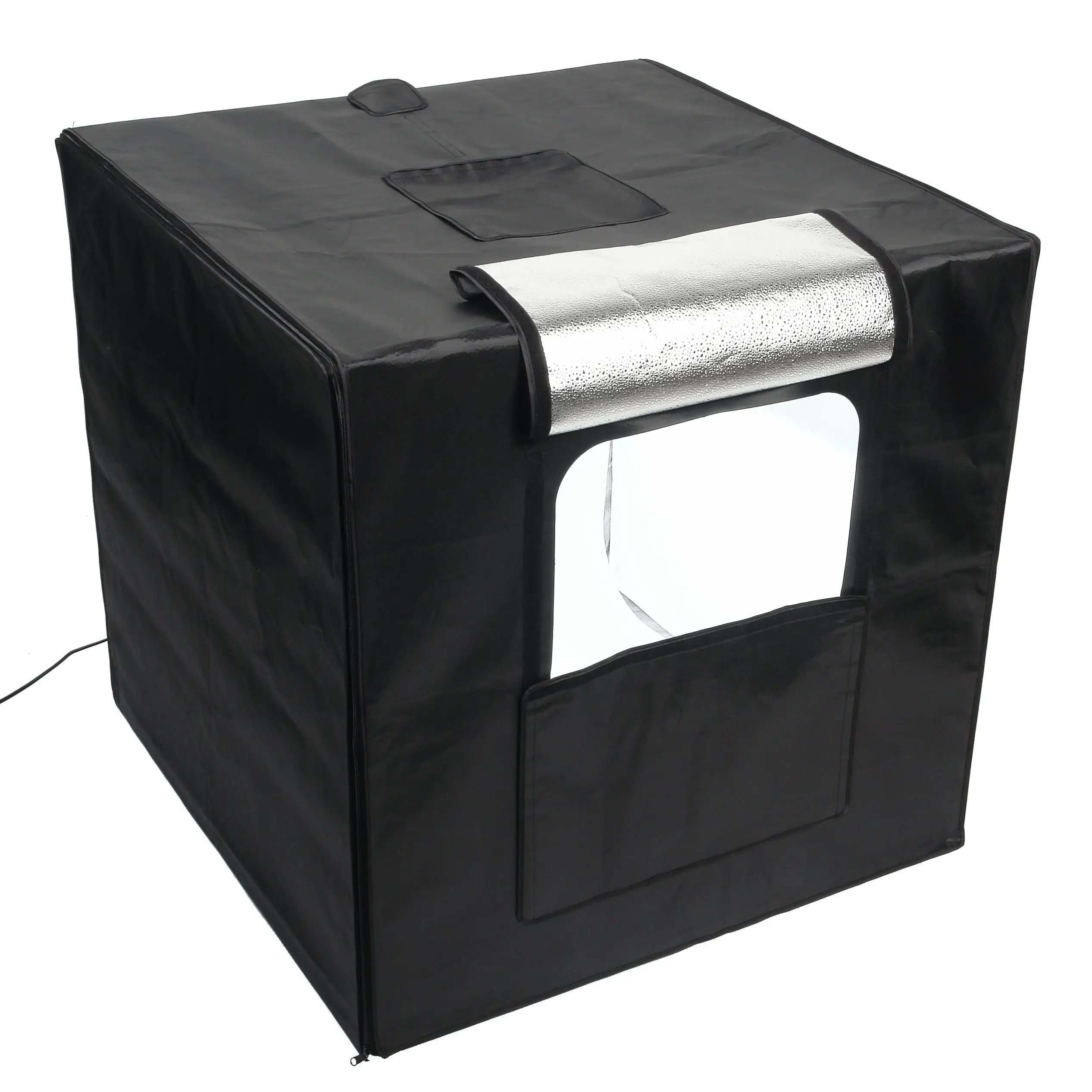 Тент фотобокса имеет два проема для камер (фронтальное 55?38 см и верхнее ? 20 см) и проем для кабелей ? 5 см. Также есть возможность откинуть одну из боковых частей тента.