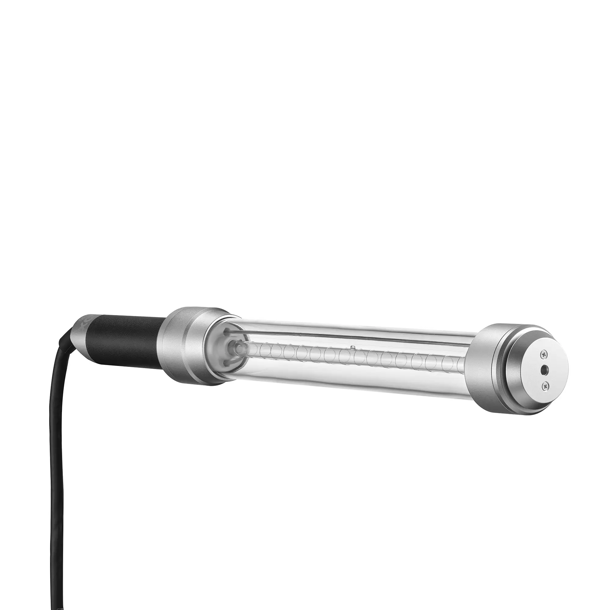 Импульсный свет, проходящий через прозрачную цилиндрическую трубку, распространяется на 360° и наилучшим образом освещает съемочную область. Выносная головка с длиной лампы ~26 см уменьшает резкость светотеневых границ и выявляет детали, сохраняя при этом эффект, создаваемый открытой лампой.