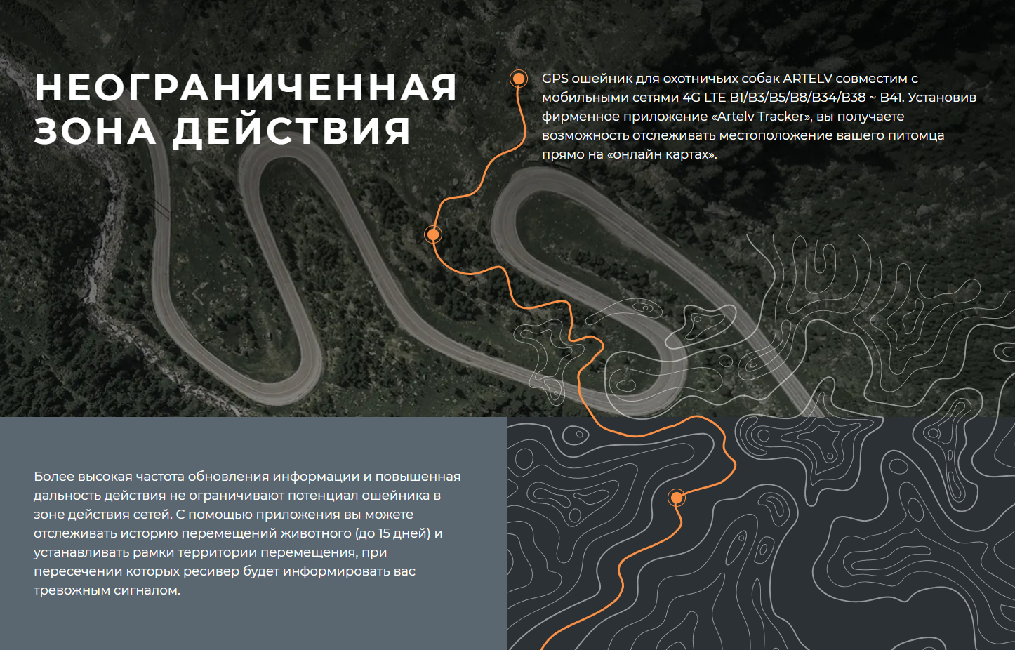 Эффективные ошейники Artelv для охотничьих собак и домашних животных поддерживают GSM и LTE сигнал с различными частотами приема и передачи, включая B1/B3/B5/B8/B34/B38 ~ B41. Местоположение животных, направление движения и скорость перемещения отображаются на картах Google Maps в режиме реального времени на вашем смартфоне или планшете с помощью специального приложения «ARTELV TRACKER». Обновление данных происходит с еще более высокой частотой, обеспечивая точность и актуальность информации. Вы можете создавать маршруты, отмечать важные точки, такие как место парковки вашего автомобиля, и просматривать историю пройденного маршрута каждого животного за выбранный промежуток времени, сохраняется вся информация за последние 15 дней. Кроме того, вы можете устанавливать географические зоны ограничений на карте. Когда ваша собака входит или выходит из заданной зоны, система сигнализирует вам с помощью тревожного сигнала, который активируется на устройстве.