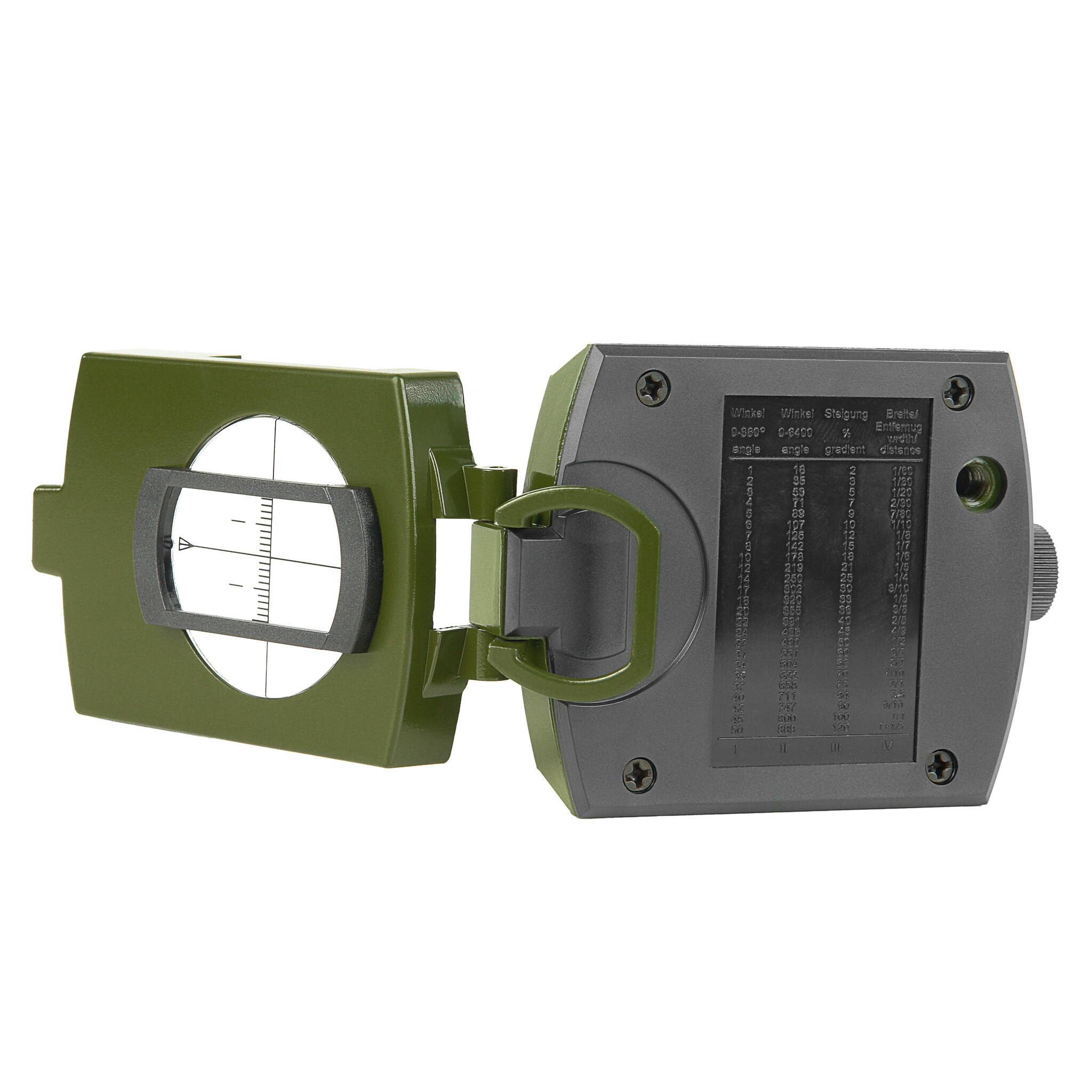 В окошке вытравлена угломерная шкала для определения расстояния между видимыми объектами, формулы приведены на задней стороне корпуса компаса.