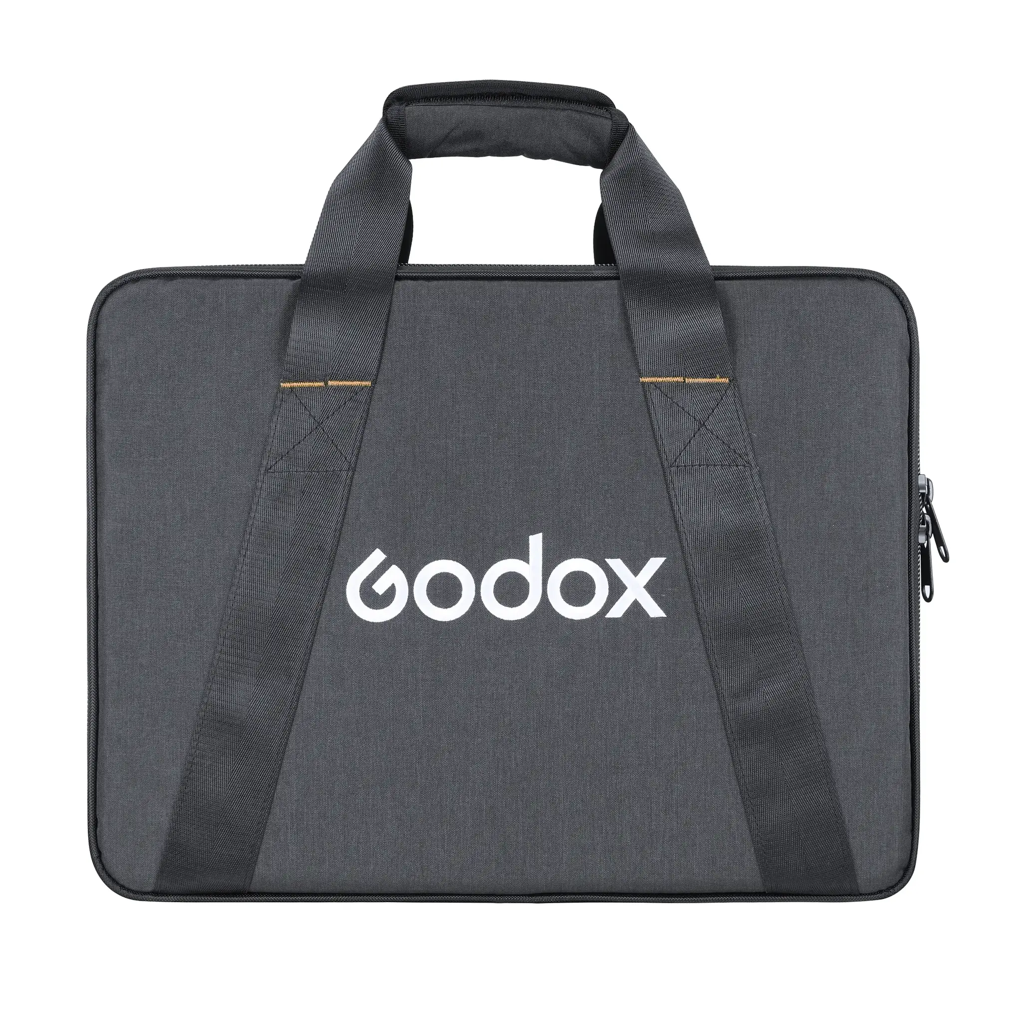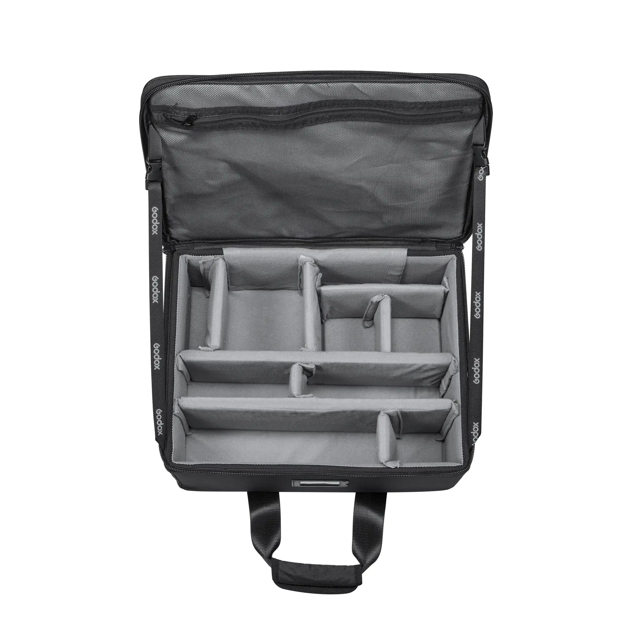 Сумка-кейс Godox CB32 на молнии с двумя ручками и наплечным ремнем вмещает все предметы комплекта. Внутренние размеры CB-33 составляют 30x40x18 см, пространство разделено переставными перегородками. Внешние размеры компактны – 32x44x22 см.