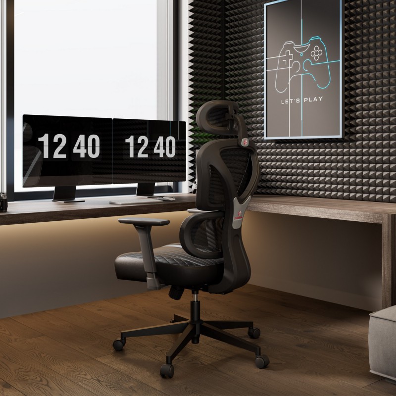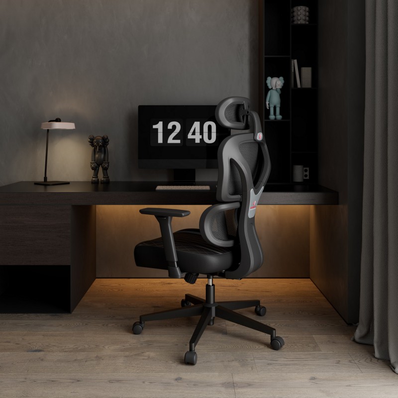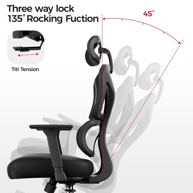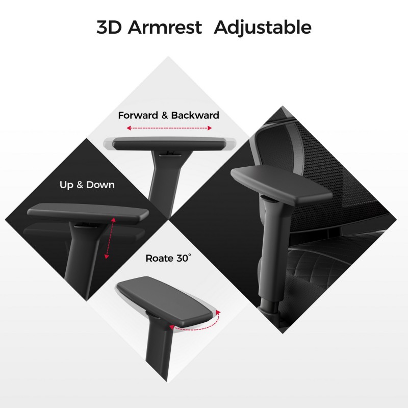 - Несколько регулируемых опций: подголовник 2D, подлокотник 3D, 3 фиксируемых положения и диапазон наклона 135 °.