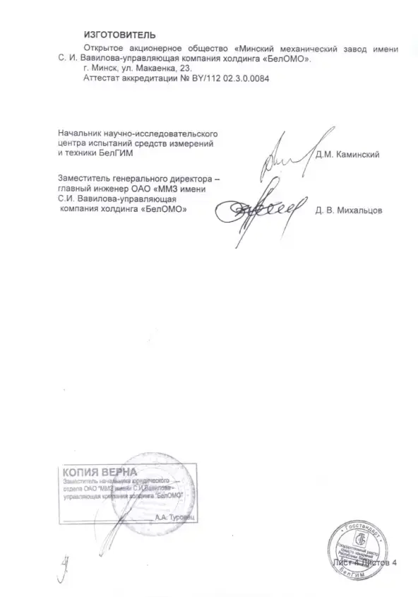- Производитель - ОАО «ММЗ имени С.И.Вавилова - управляющая компания холдинга БелОМО», Республика Беларусь