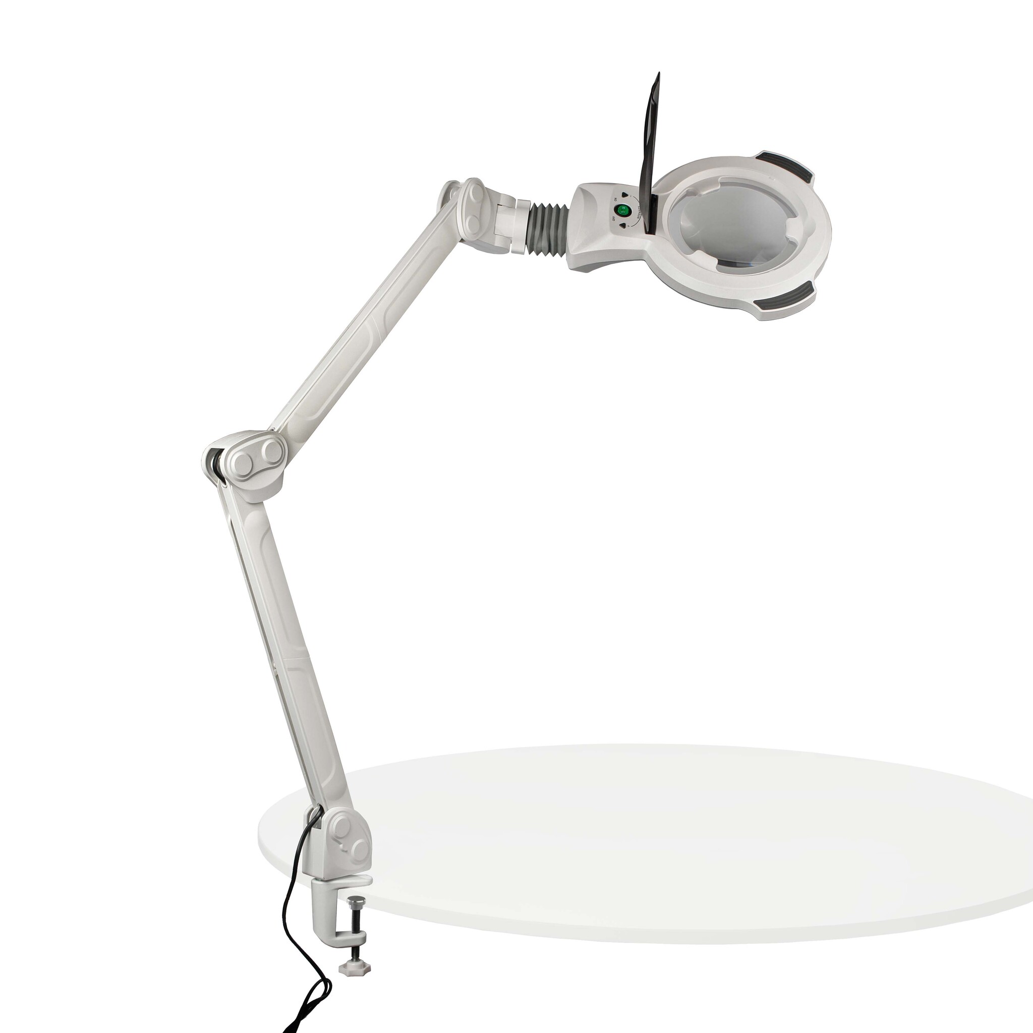 Лупа-лампа быстро и удобно крепится к столешнице или другой горизонтальной поверхности с помощью струбцины через металлический адаптер в нижней части лампы.