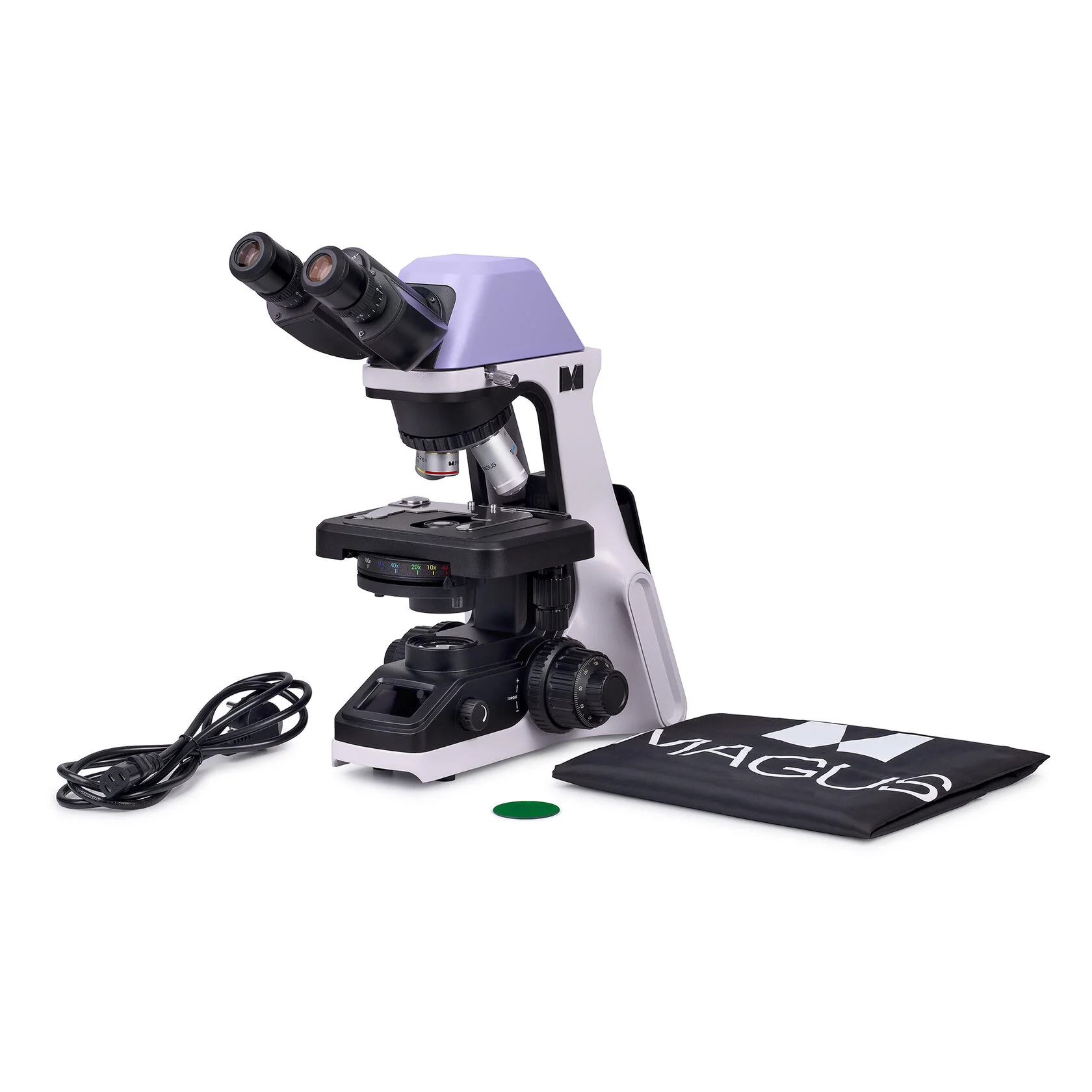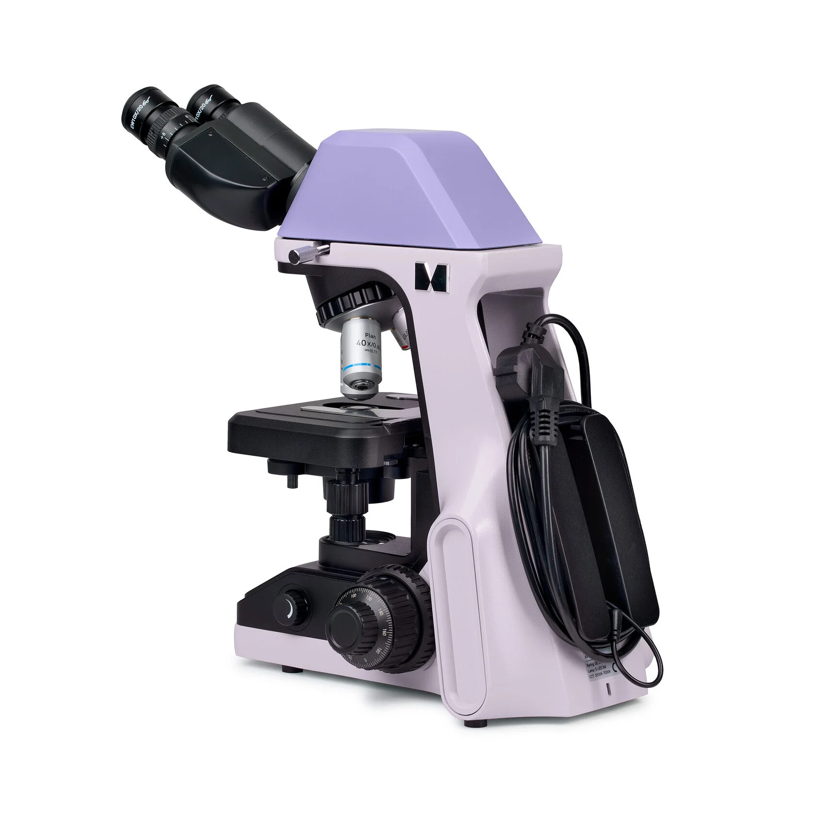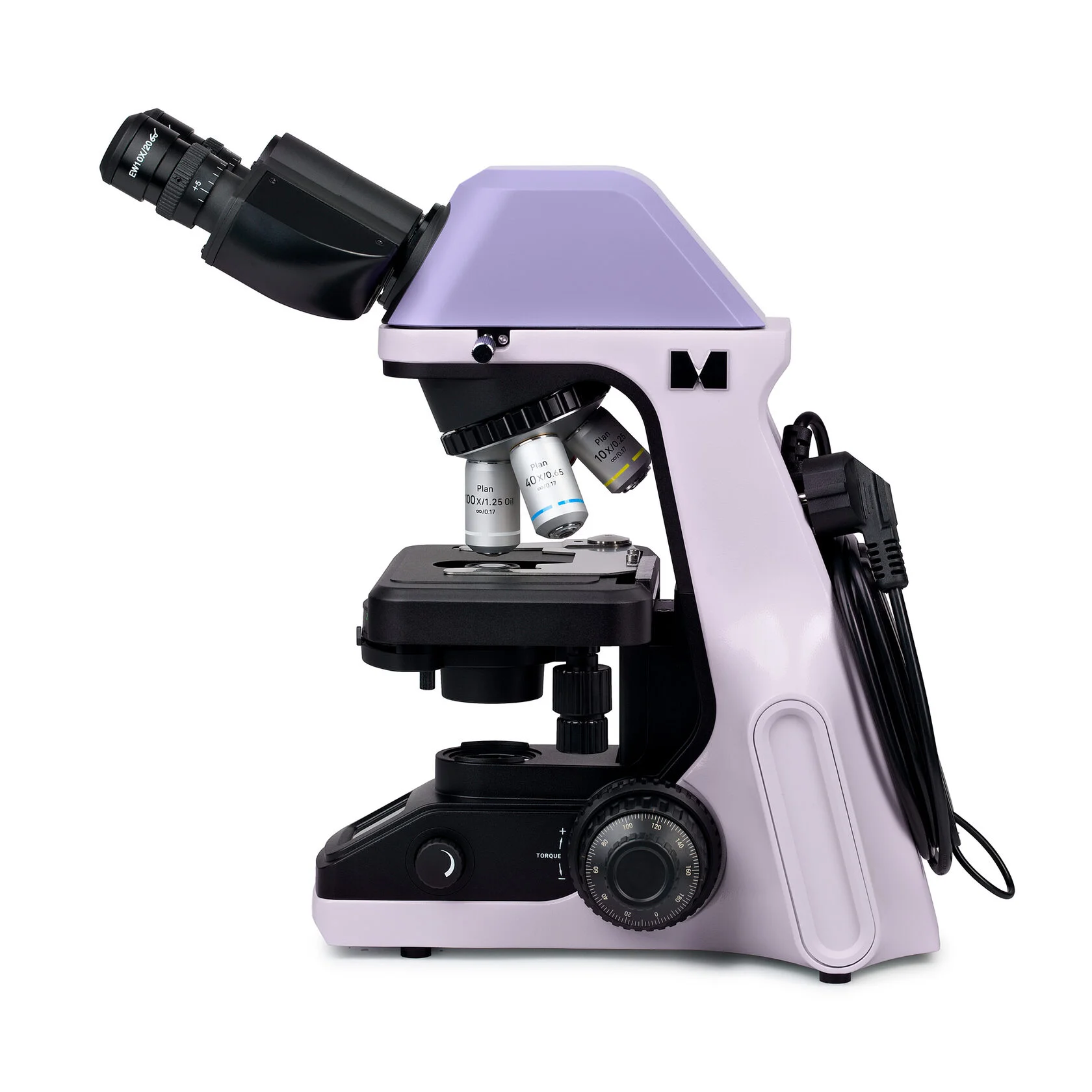 Микроскоп MAGUS Bio 240B предназначен для студенческих исследований и позволяет изучать биологические образцы по методу светлого поля в проходящем свете. Микроскоп имеет несколько полезных особенностей, выделяющих его среди других моделей. Первая из них – это кодированный револьвер с индивидуальными параметрами освещения для каждого объектива (всего их 4). Следующая особенность – наличие LCD-экрана, на котором отображаются текущие параметры работы, а также можно регулировать настройки освещения. И, наконец, микроскоп обладает функциональной оптимизированной конструкцией: все шнуры и устройства питания спрятаны на заднюю стенку корпуса, а передвигать или переносить прибор можно за боковины, которые представляют собой ручки.