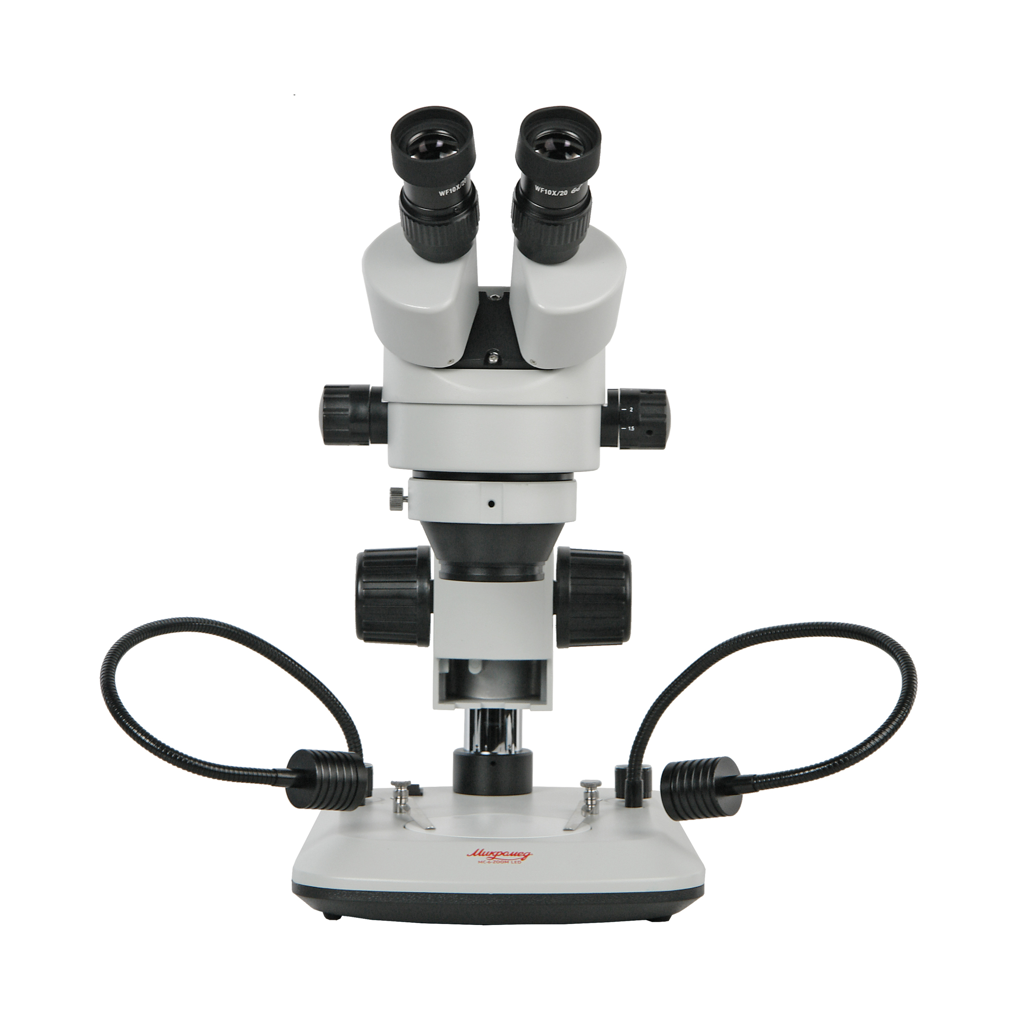 Благодаря применению специально рассчитанных объективов, микроскоп позволяет работать в широком диапазоне увеличений от 7х до 45х и сохранять неизменно высокое качество изображения. Изменение увеличения микроскопа бесступенчатое и осуществляется поворотом барабанчиков, выведенных на обе стороны штатива. Барабанчики снабжены механизмами клик-стоп, что позволяет с высокой точностью и повторяемостью устанавливать необходимые значения увеличений.