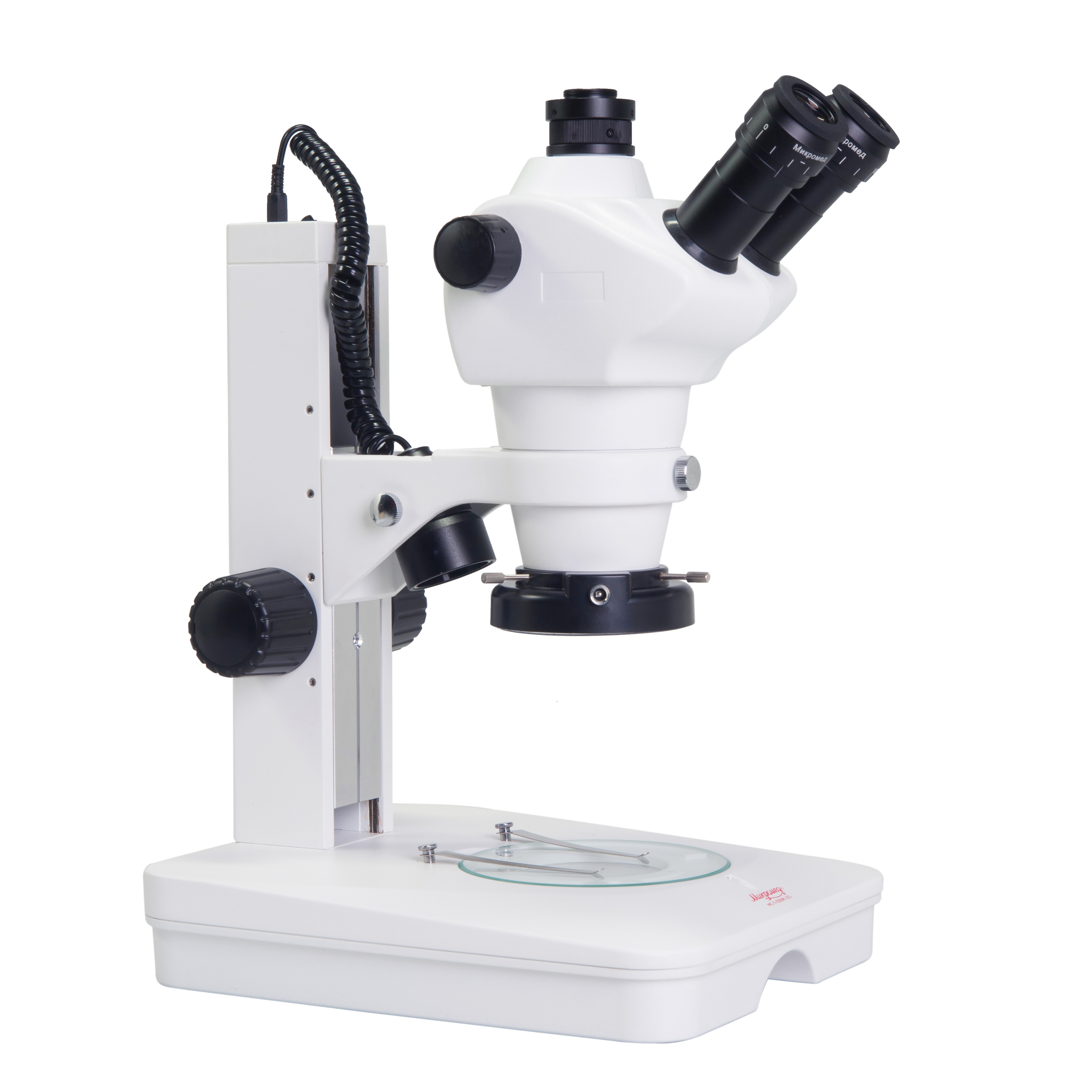 Осветитель проходящего света позволяет исследовать прозрачные образцы, что делает микроскоп востребованным в биологических лабораториях и в фармацевтической промышленности. Осветитель встроен в основание микроскопа, служащее предметным столиком, и включает в себя светодиодный блок из 36 светодиодов общей мощностью 3 Вт со встроенным диффузором. Подобная конструкция позволяет достигать равномерности и высокой яркости освещения. Для размещения объекта используются круглые вставки – стеклянная полупрозрачная матовая для проходящего света, и двухсторонняя черная / белая для отраженного света. Диаметр вставок 125 мм.