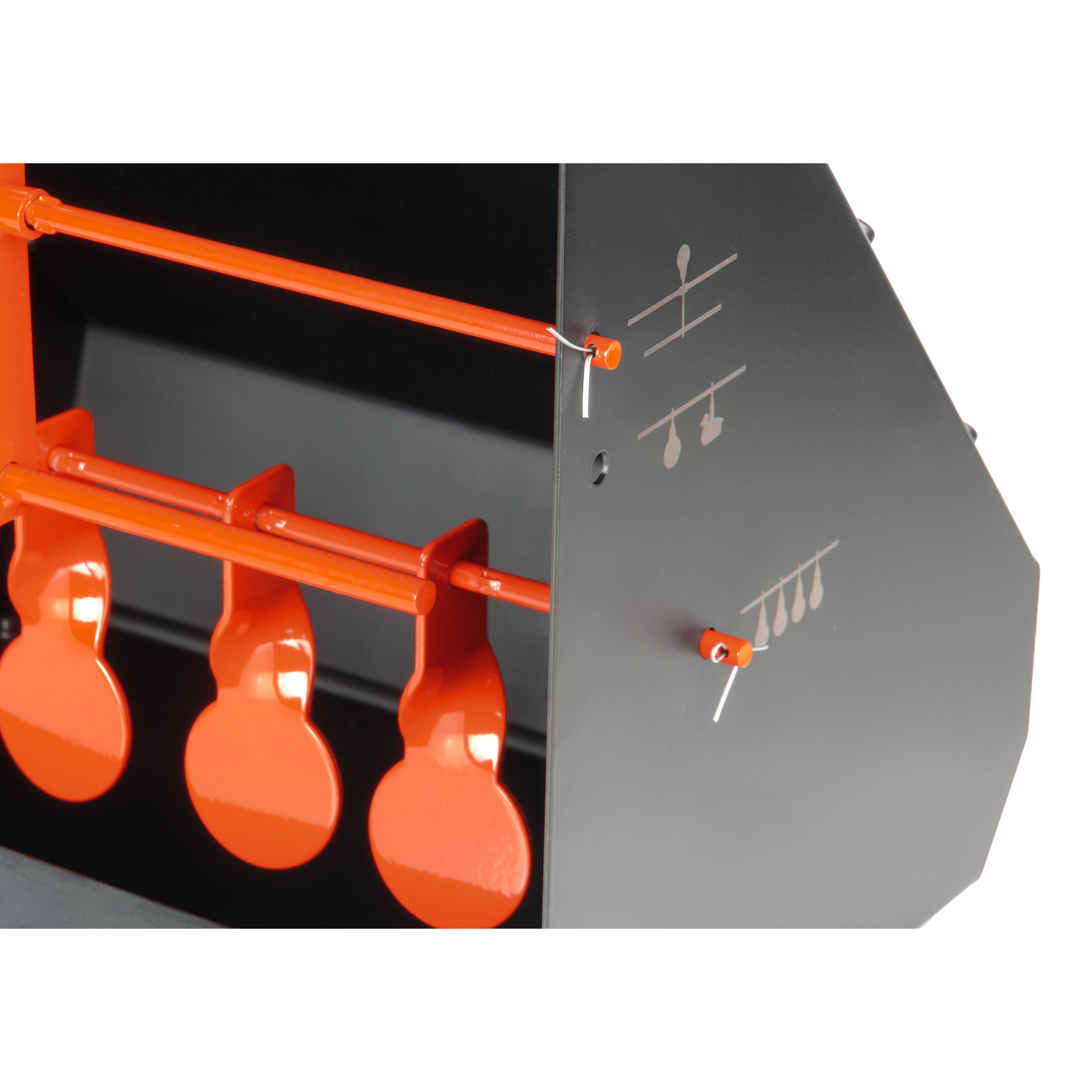 Миниатюрный тир оснащен ярко окрашенными металлическими мишенями на 5 целей, подвешенными на перекладине. При точном попадании мишени проворачиваются вокруг оси, создавая хорошо слышимый металлический щелчок. Такая реакция цели позволяет вести скоростную стрельбу без необходимости ручного возврата мишеней в исходное положение.