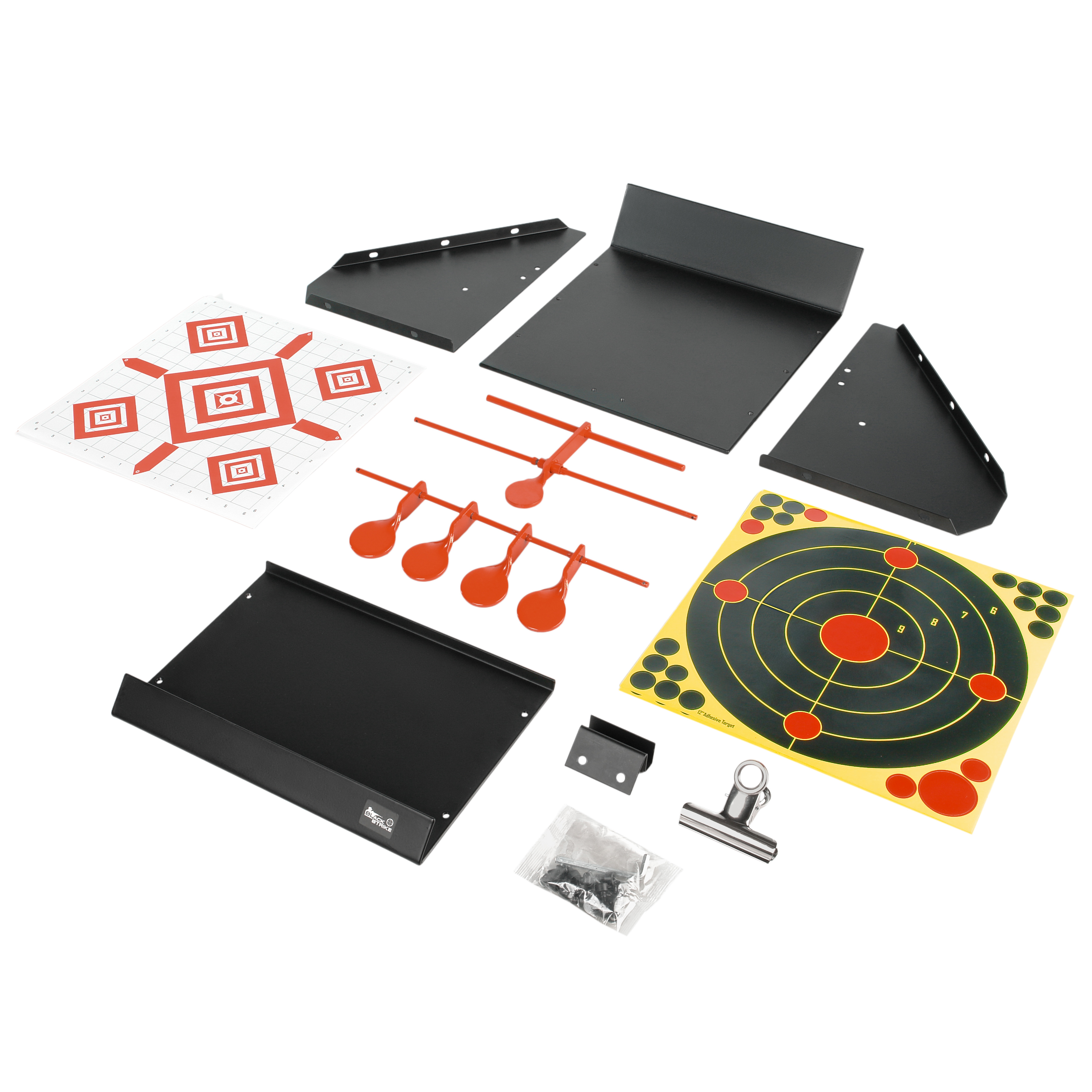 Миниатюрный тир оснащен ярко окрашенными металлическими мишенями на 5 целей, подвешенными на перекладине. При точном попадании мишени проворачиваются вокруг оси, создавая хорошо слышимый металлический щелчок. Такая реакция цели позволяет вести скоростную стрельбу без необходимости ручного возврата мишеней в исходное положение.