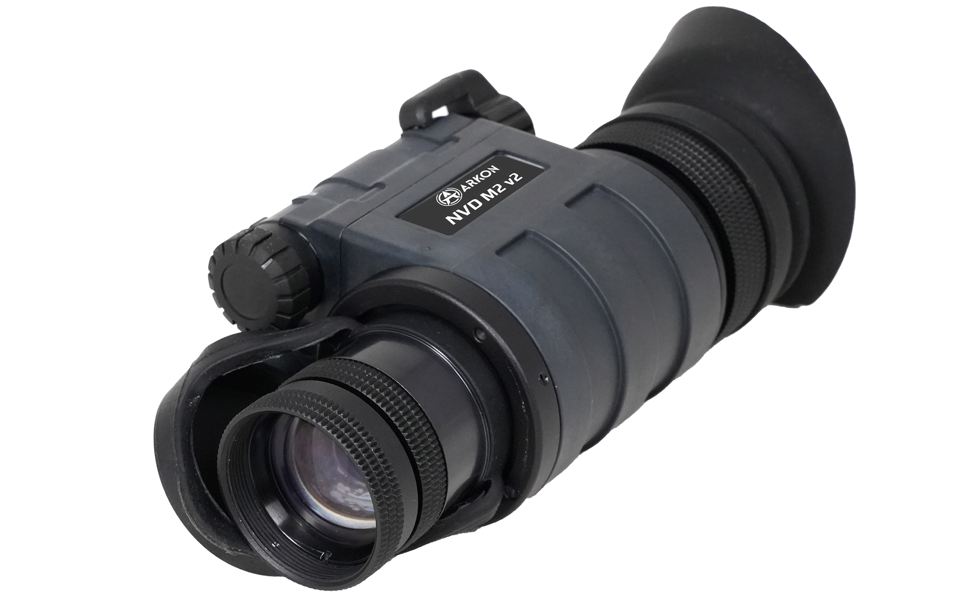 Монокуляр ночного видения ARKON NVD M2 V2 оснащен стандартным оптическим модулем с широкоугольным объективом, у которого фокусное расстояние равно 25 мм, а апертура f1,2. Пространственный угол поля зрения FOV (Field of view) равен 40°, что в пересчете на линейное расстояние предоставит для видимости область пространства шириной 72 метра на удалении 100 метров. Фокусировочный механизм расположен на объективе. Низкопрофильное кольцо с глубокой насечкой позволяет наводить резкость даже в тактических перчатках. На окуляре имеется кольцо диоптрийной корректировки и резиновый наглазник скошенной формы. Диапазон фокусировки начинается от 25 см.