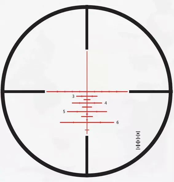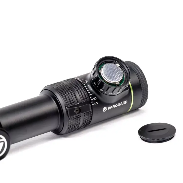 Выгравированная на стекле метка располагается во 2 фокальной плоскости (SFP), отличается минимальным перекрытием цели и при смене увеличения не меняет своих видимых размеров. Перекрестье подсвечивается красным, а 11 уровней яркости позволяют целиться днём, в сумерках и не зависеть от внешней освещённости. В промежуточных положениях, отмеченных на барабанчике точками, подсветка отключается. Так что при переноске и хранении прицела можно сохранить настройки яркости и сэкономить заряд батарейки.