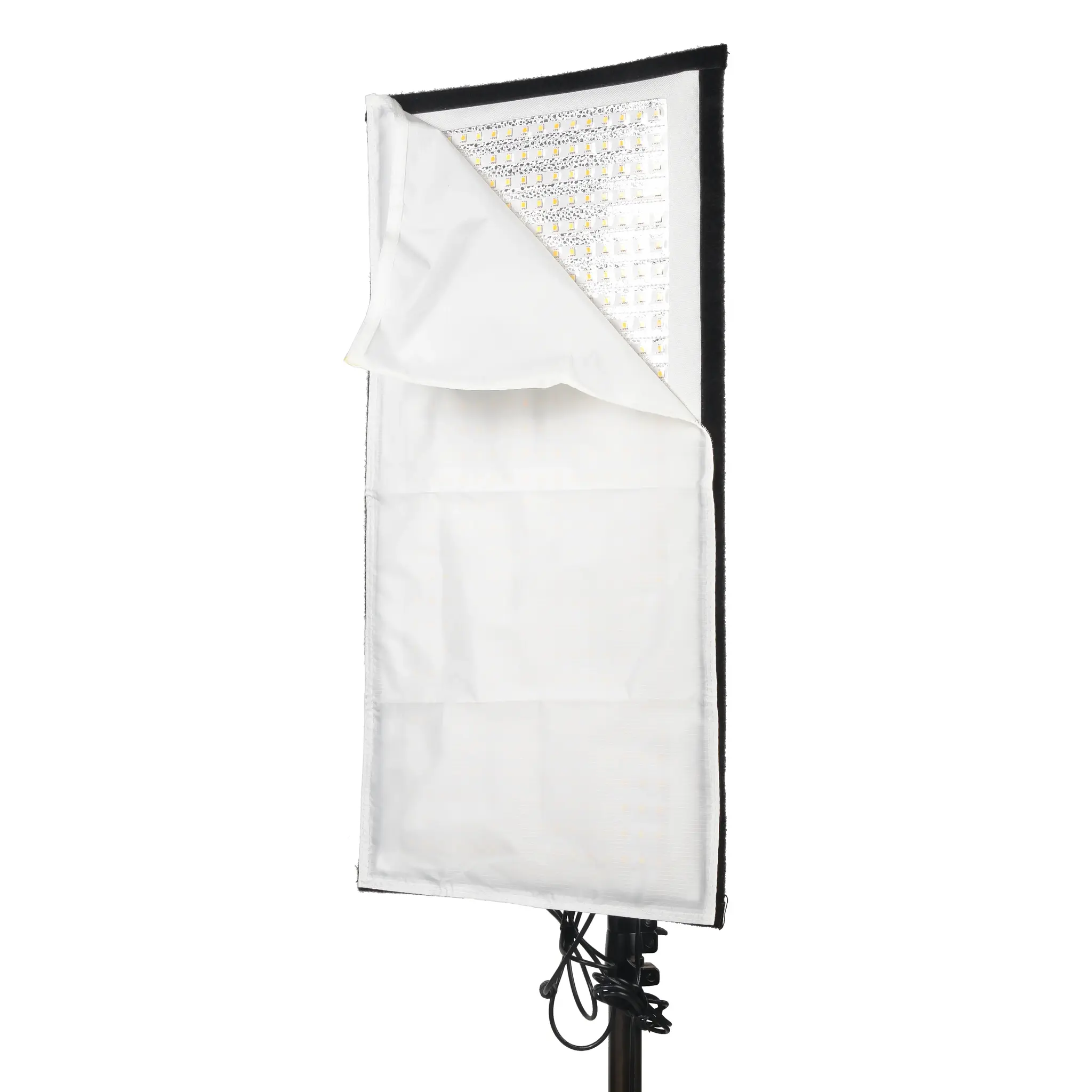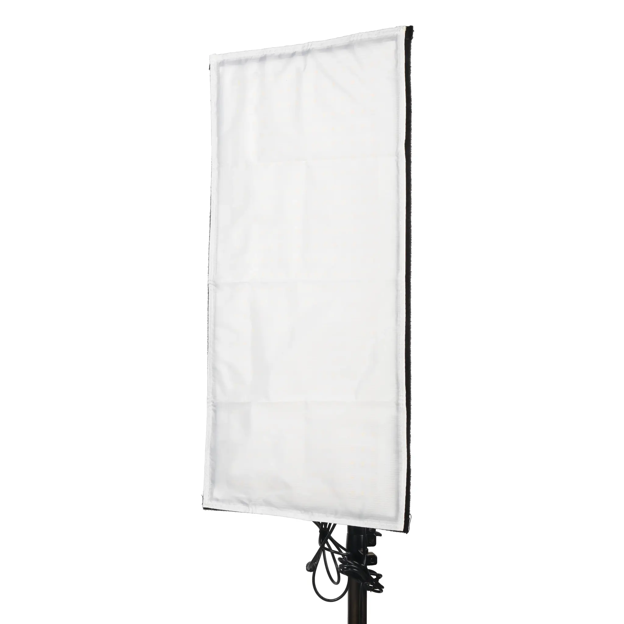 Крепление рассеивателя производится с помощью липучки к лицевой стороне панели. На обратной стороне светодиодной панели также размещена липучка, на которую можно прикрепить контроллер и сетевой адаптер при помощи комплектных лент-липучек.