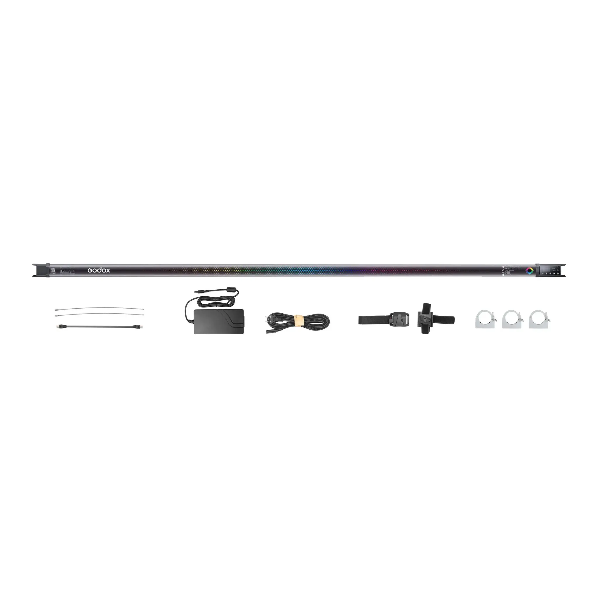 Осветитель длиной 180 см и весом всего 2.21 кг легко удерживается в руке или закрепляется на осветительной стойке. Для этого комплект входят три металлических зажима-клипа, которые помогут установить устройство на любом держателе (с резьбой ?''), и два металлических тросика для страховки или подвешивания.