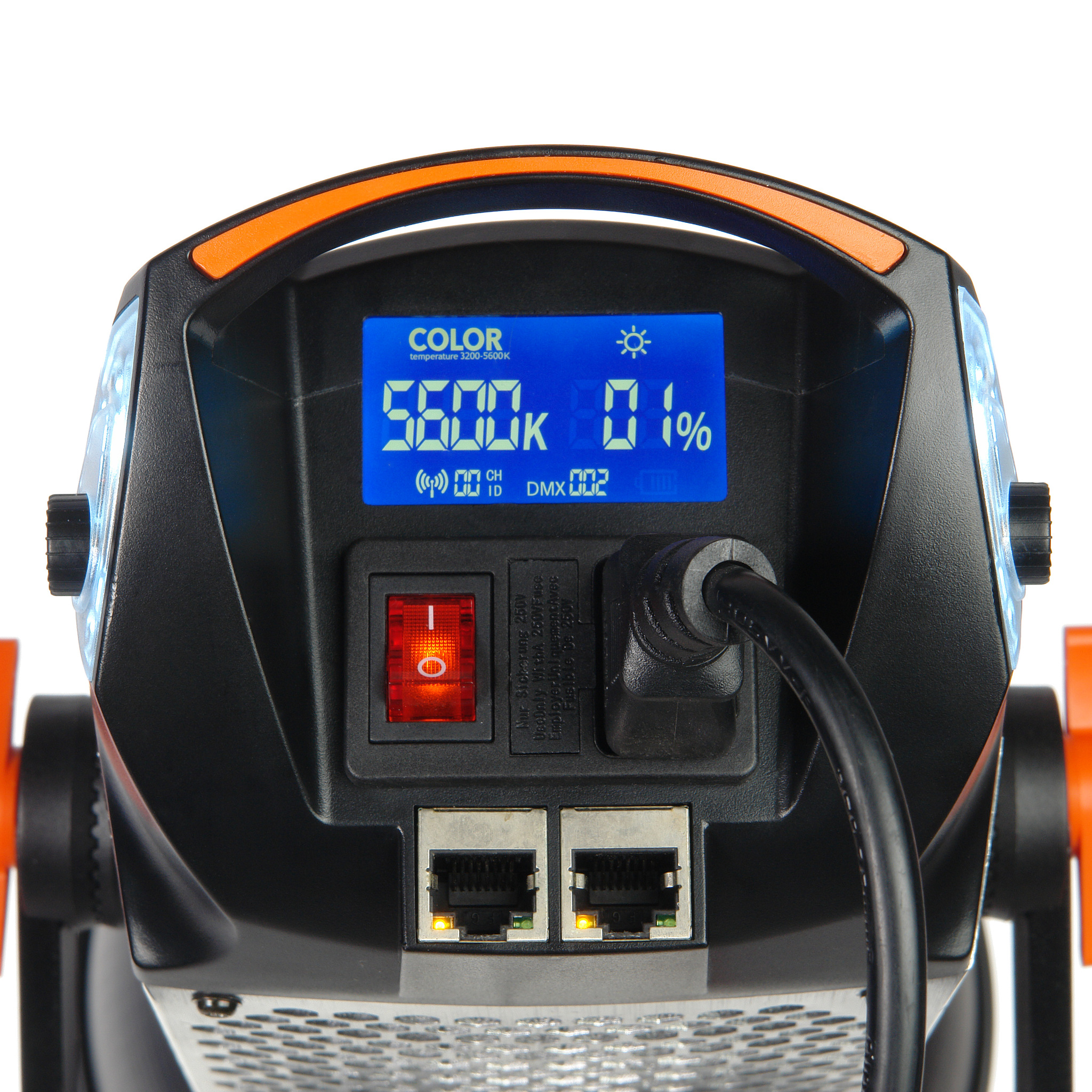 Два диммера с подсветкой, расположенные слева и справа на корпусе осветителя, предназначены для ручного управления и настройки. Правый диммер отвечает за установку мощности осветителя, а нажатие диммера в качестве кнопки помогает выбрать канал DMX. Левый диммер – за настройку и выбор номера ID радиоканала.