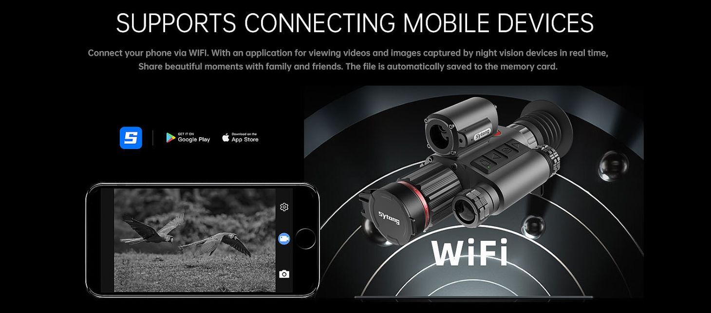 Запись и трансляция изображения. Встроенный рекордер пригодится для съёмки на охоте, на прогулке или на приваде: сохранит на съёмную карту десятки фото и видеофайлов, причём с озвучкой и указанием даты и времени записи (карта объёмом до 128 ГБ приобретается отдельно). А вот модуль Wi-Fi и установленное на телефон приложение Sytong Outdoor позволят удалённо менять настройки, вести наблюдения с экрана смартфона или съёмку на его же камеру.