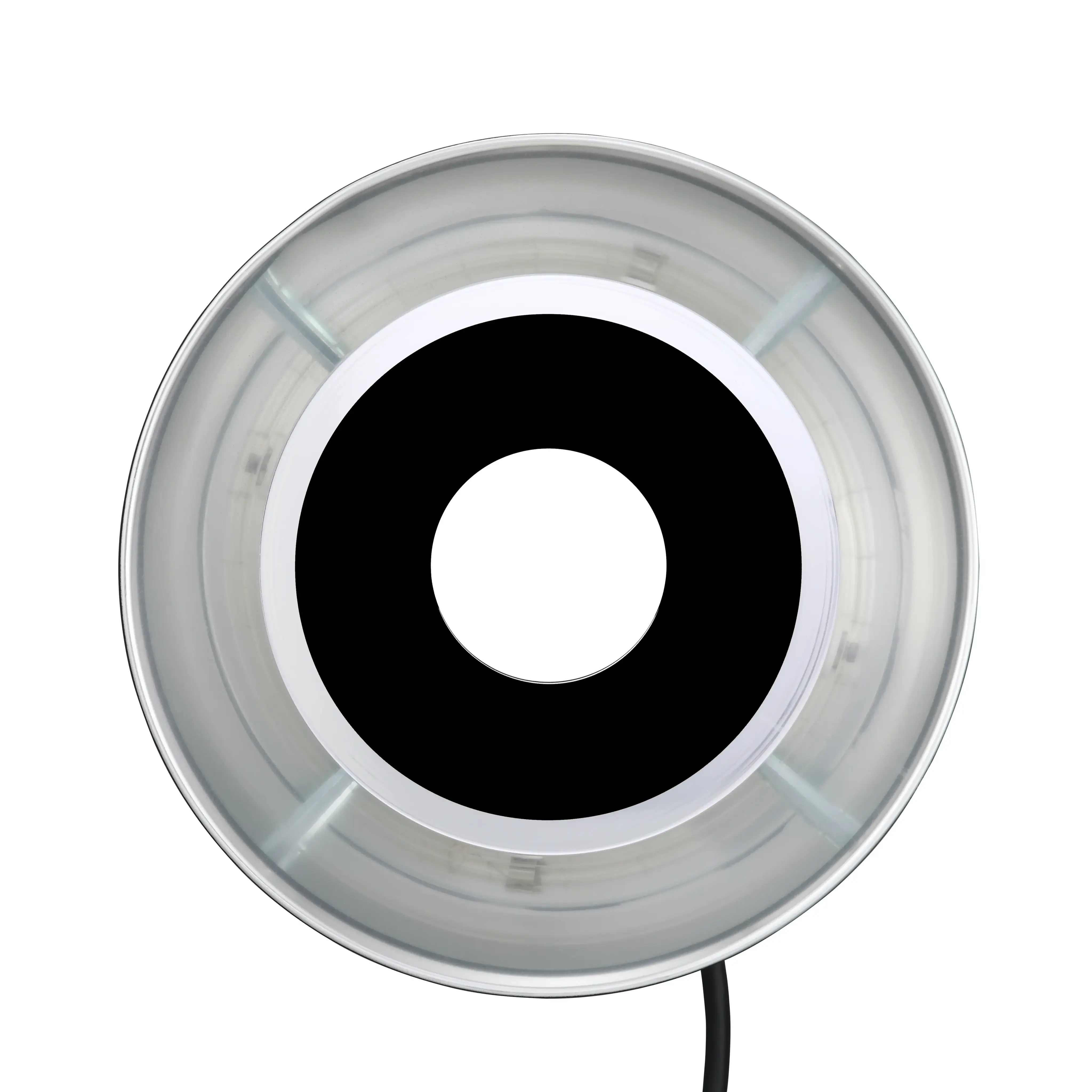 Рефлектор диаметром 38.5 см и глубиной 6.9 см изготовлен из металла, надежен и долговечен в использовании. Толстое защитное стекло рефлектора дополнительно обезопасит импульсную лампу выносной головы во время съемок.