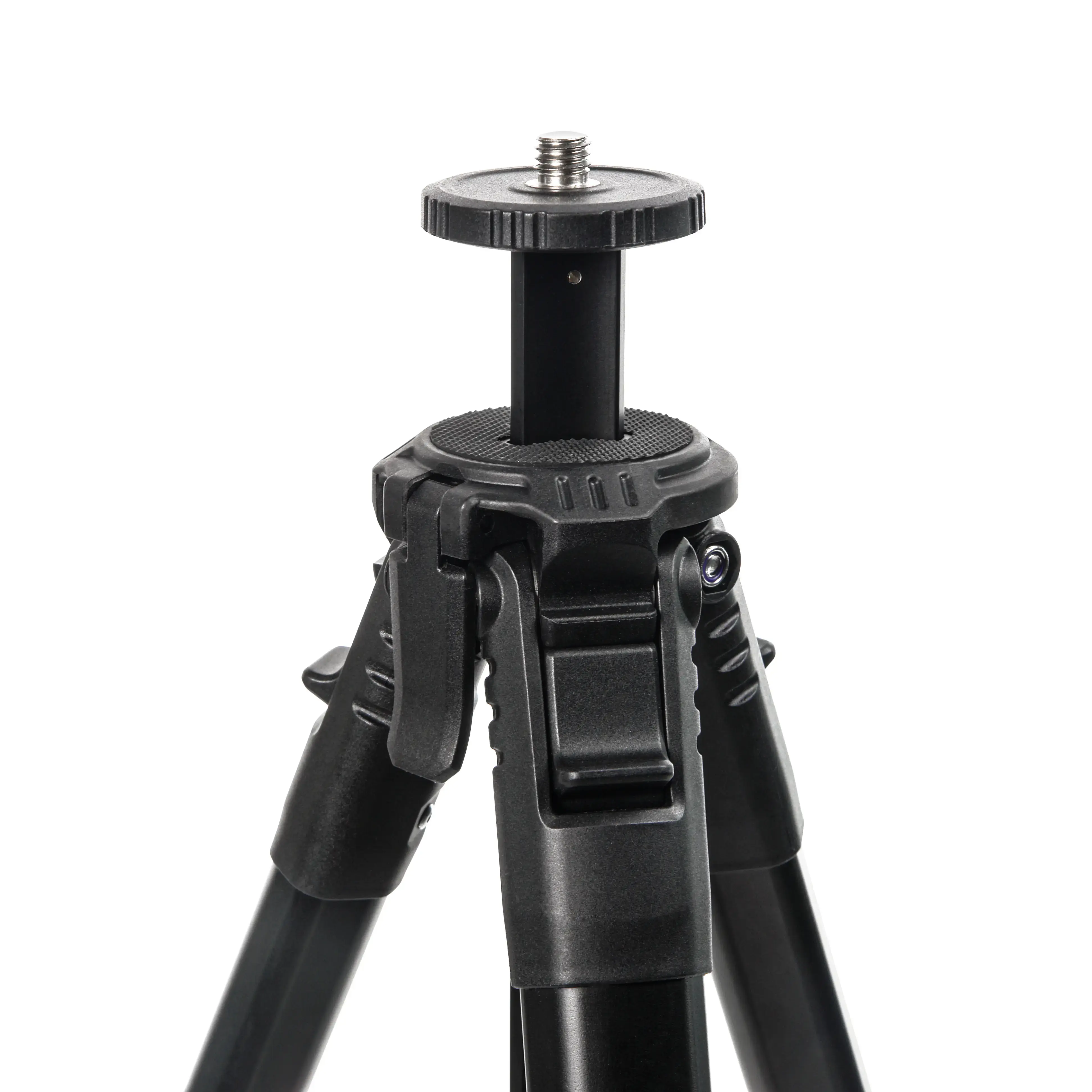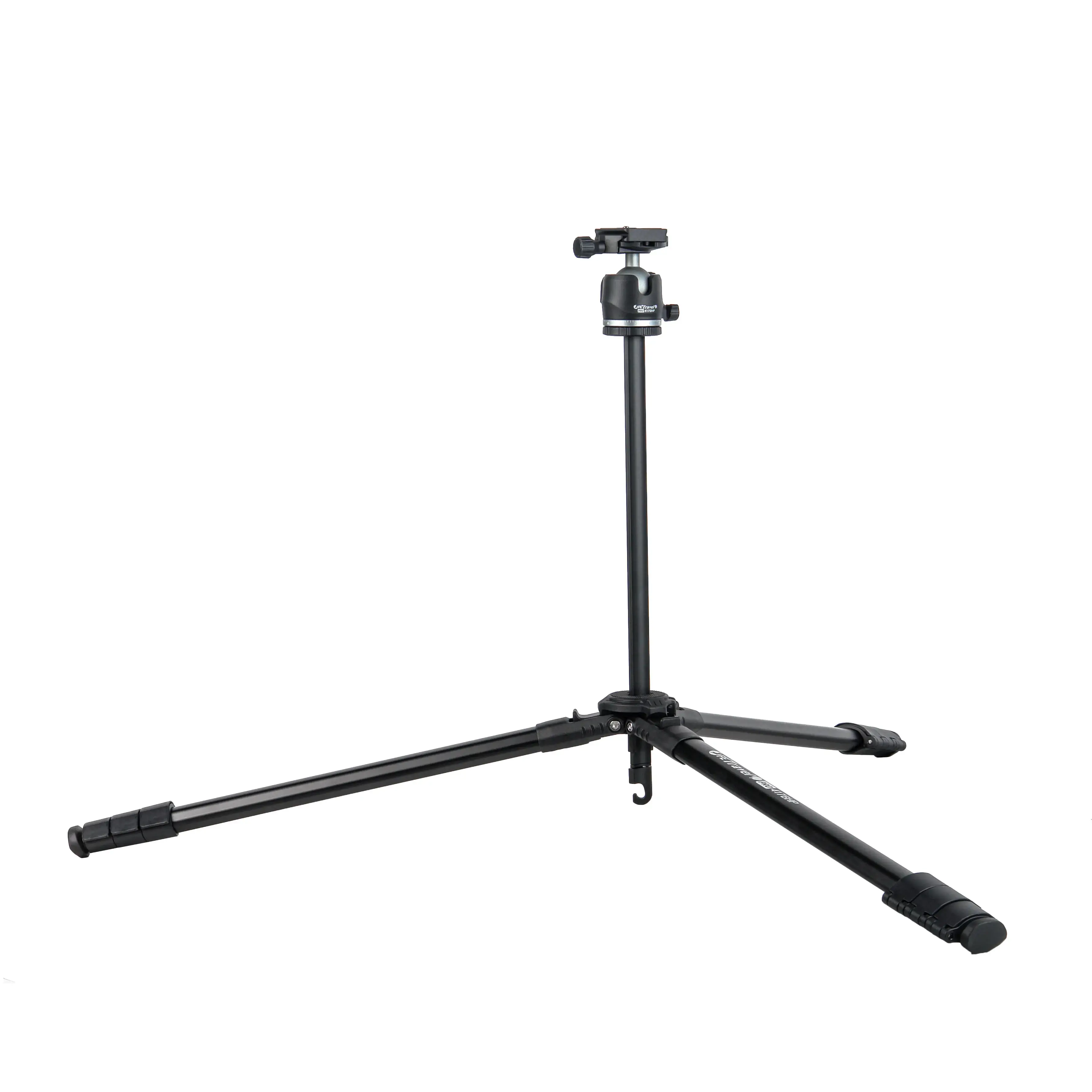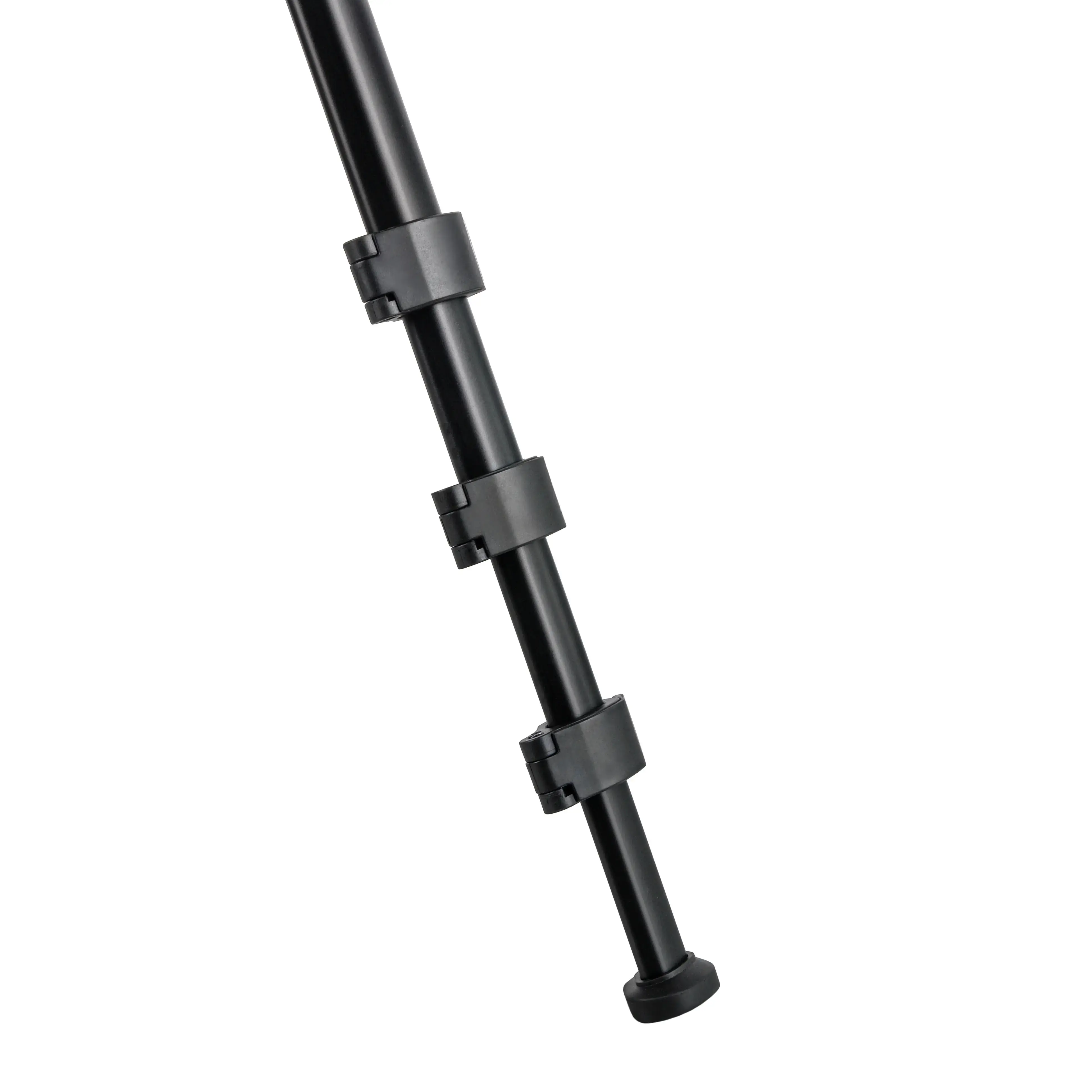 Алюминиевая тренога штатива состоит из 4-х секций, фиксируемых клипсовыми зажимами. Ноги трипода могут быть жестко закреплены в двух положениях: под углом 20° и 80°. Положение ног легко и быстро меняется за счет пружинных кнопок-фиксаторов.