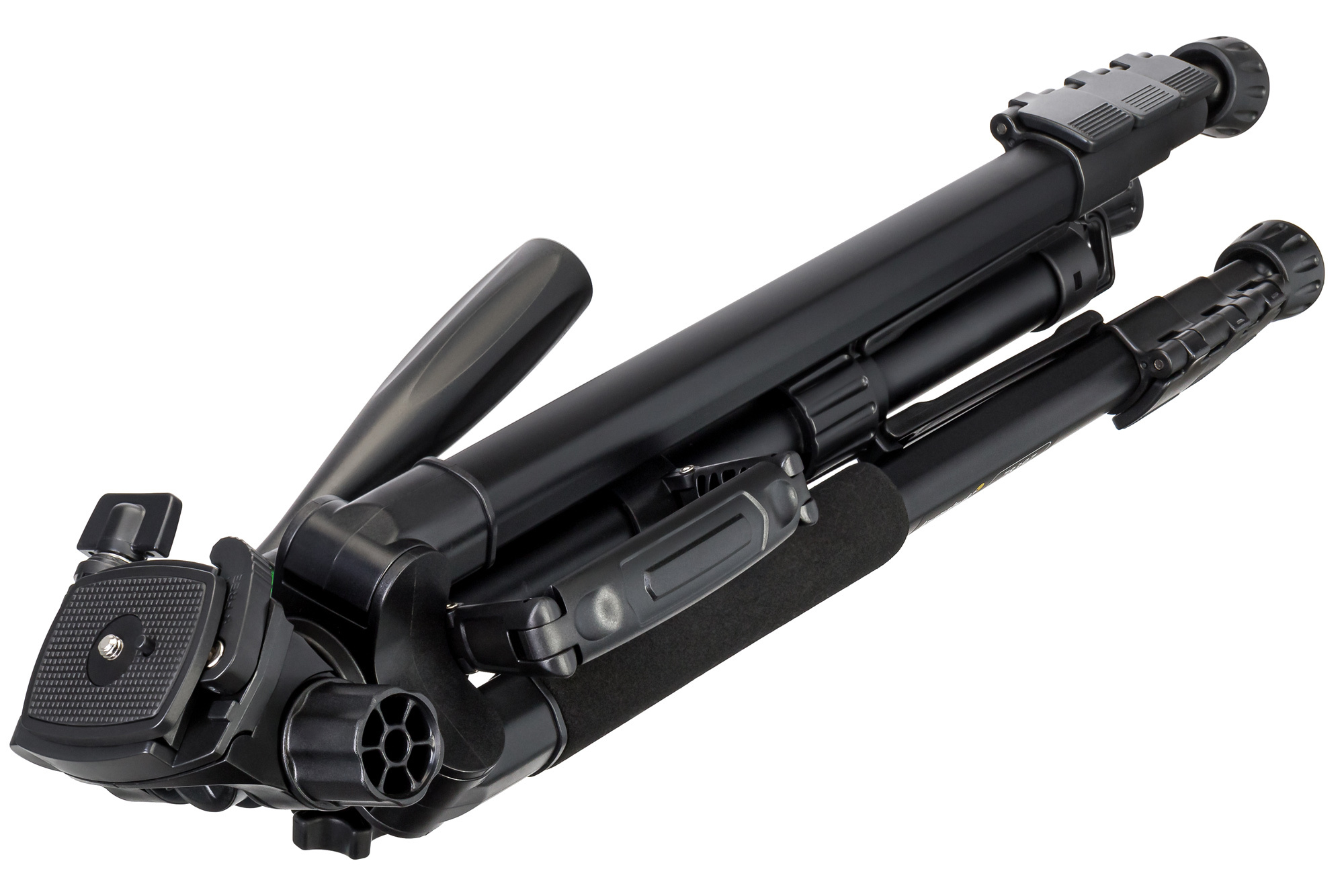Высоту штатива можно регулировать в широком диапазоне: от 460 до 1760 мм. Можно выдвинуть или задвинуть ножки, закрепив их в нужном положении быстрозажимными флип-замками. Также отдельной ручкой можно поднять или опустить центральную штангу. При установке штанги в самое высокое положение рекомендуется повесить на центральный крюк утяжелитель – это повысит устойчивость штатива. Чтобы установить штатив максимально ровно относительно горизонта, используйте встроенный пузырьковый уровень.