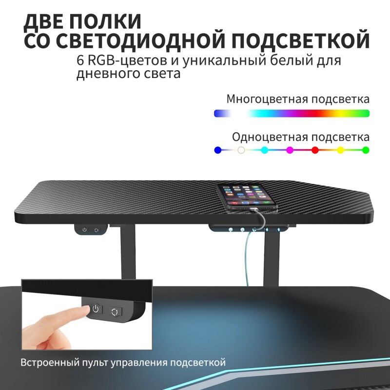 Полная функциональность: игровой стол поставляется с 2 полками под мониторы с RGB-подсветкой для ПК-геймеров и стримеров. 2 слота под планшеты служат для установки мобильных телефонов и планшетов. 2 отверстия для кабелей и 2 силовых подрозетника позволяют удобно организовать рабочее пространство. Подстаканник и двойной держатель наушников по боковым сторонам столешницы. Вы получите идеальную боевую станцию для победы над соперниками.