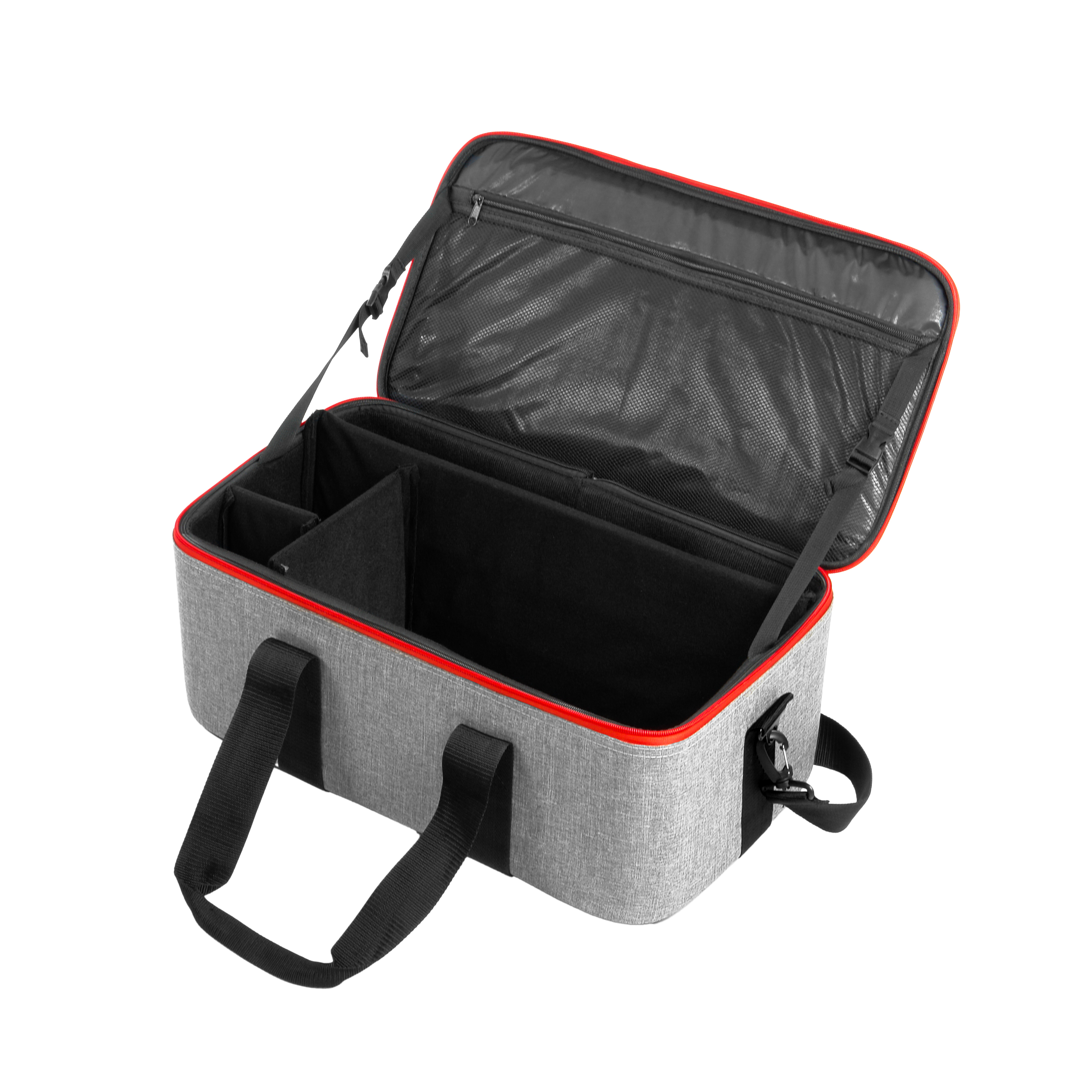 Для комфортного пользования в уличных и студийных условиях на внешнем дне сумки предусмотрены пластиковые полозья высотой 17 мм, которые защищают ткань корпуса от загрязнения. Удобство транспортировки обеспечено за счет двух ручек с фиксатором и съемного ремня на металлической фурнитуре.