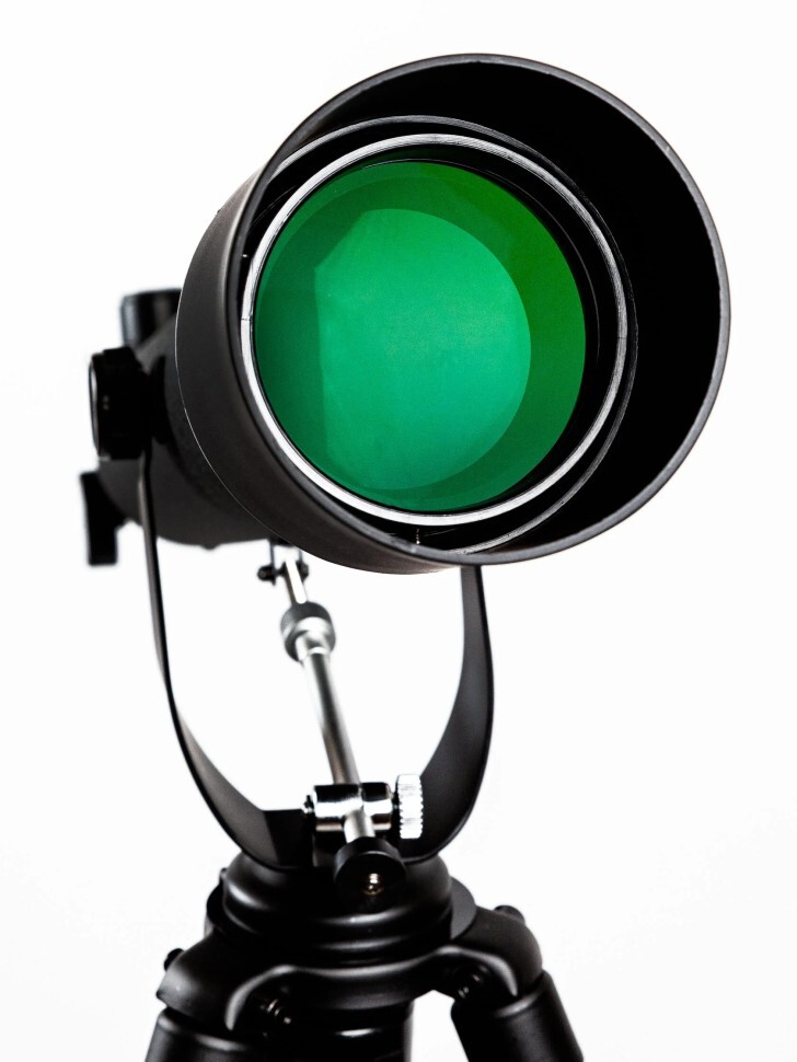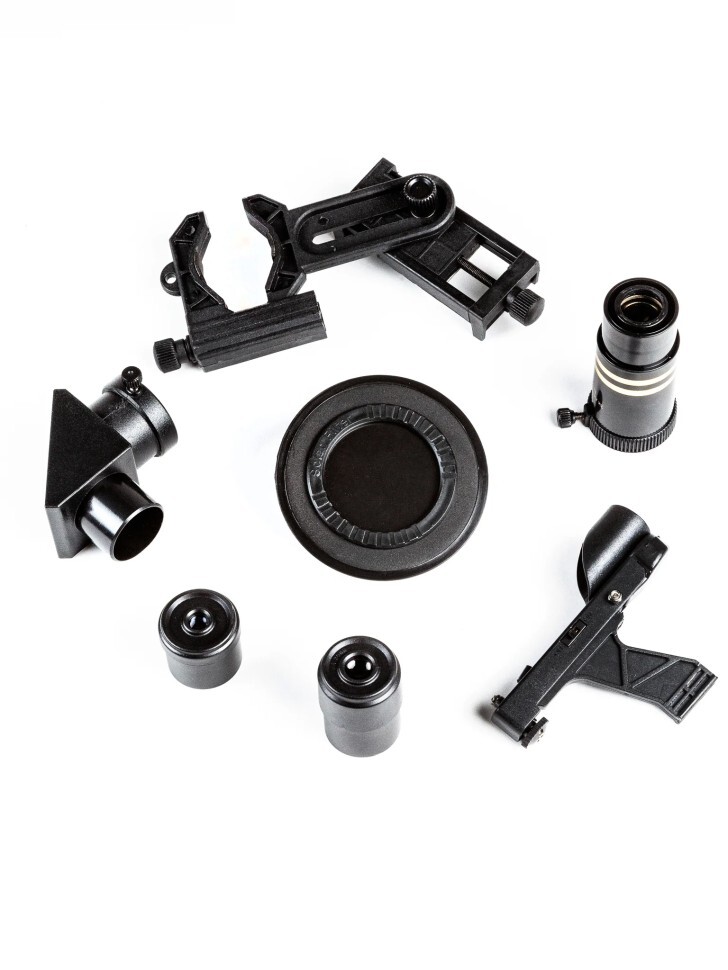 Это классический среднеразмерный телескоп для начинающих любителей астрономии. Он мобилен, легко собирается и подходит для наблюдений Луны, планет, а также скоплений звезд и ярких туманностей. Двухлинзовый объектив и окуляры имеют зеленое и синее просветление.