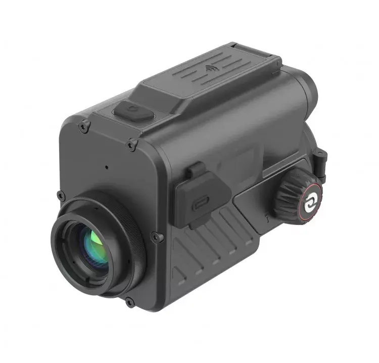 Насадка Guide TB430 оснащена объективом F35mm/1,0 с диаметром линзы 35 мм и рассчитана на большие дистанции, чем Guide TB420. Светосила выше, чем у моделей с объективом F25mm, дальность обнаружения больше на 500 м — до 1,8 км, кратность такая же — 1x (без цифрового зума), а вот поле зрения меньше — 7,8x5,9 град. Для фокусировки используется не один барабанчик, а сразу два — слева и справа: комфортная настройка любой рукой и с любой стороны.