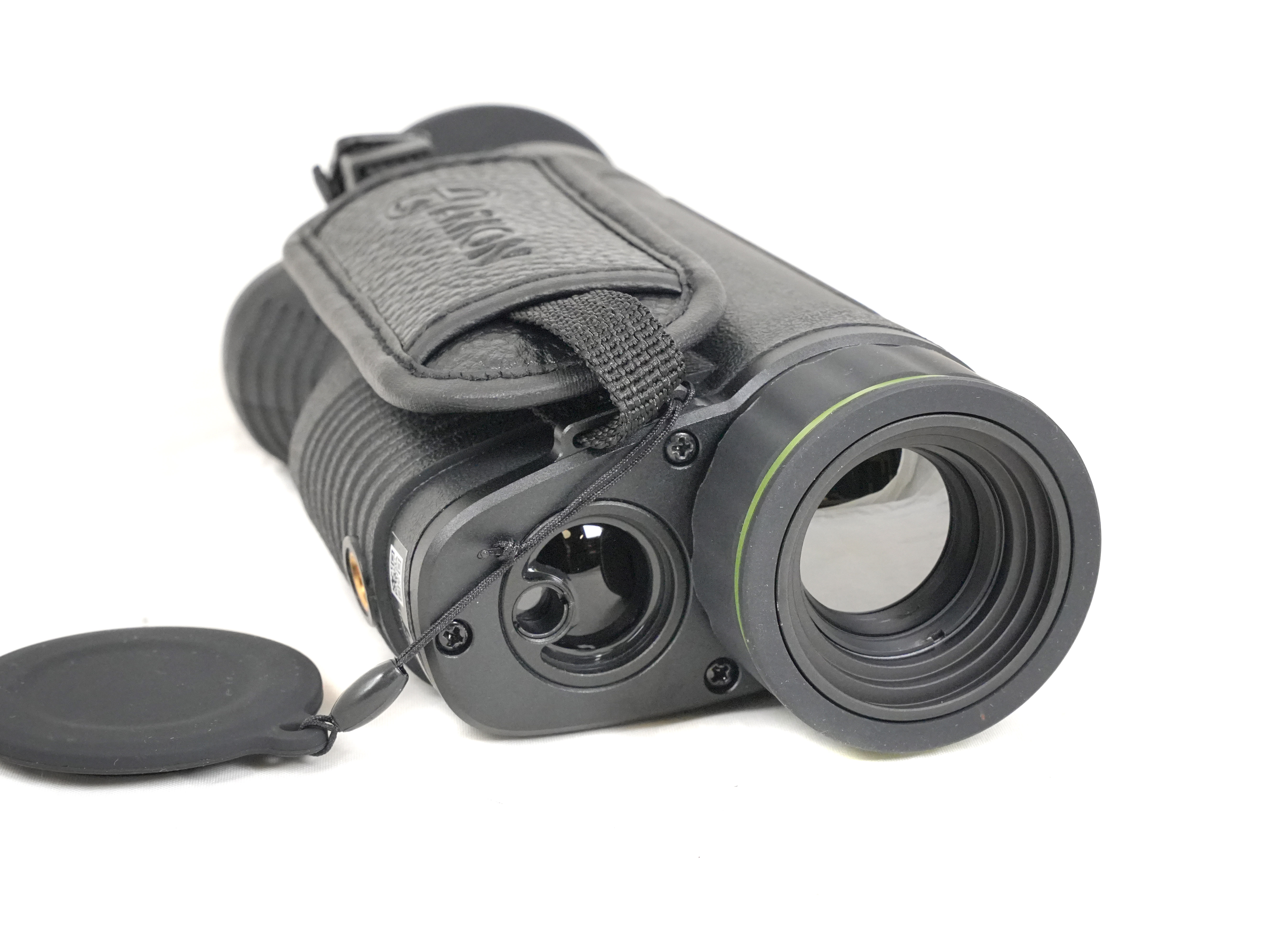 Данная модель имеет германиевый объектив с фокусным расстоянием 25 мм и относительным отверстием 1.0, обеспечивая начальное оптическое увеличение 2,7х. Функция цифрового зума позволяет изменять масштаб в пределах от 1х до 8х, позволяя достигать максимального значения кратности в 21,6х. Объектив обладает широким углом обзора FOV (Field of view) 10,5° х 7,9°, что соответствует видимой области пространства размером 18,4 х 13,8 м на дистанции 100 метров.