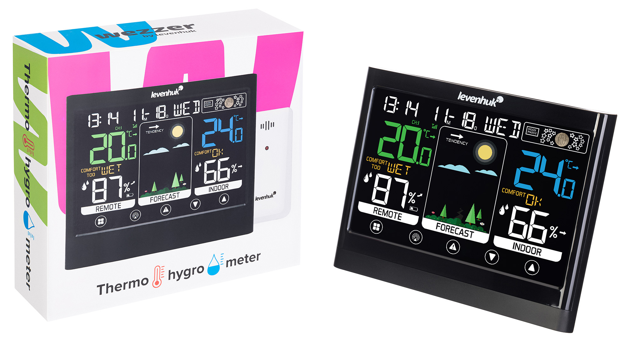 Термогигрометр проводит измерения сразу в двух местах: внешний датчик можно разместить на удалении до 80 метров от основного модуля. Показания самого термогигрометра отображаются в правой части экрана, датчика – в левой. Здесь же приводятся оценки уровня общего комфорта, по которым легко определить, все ли благоприятно. Центральный блок экрана посвящен прогнозу погоды и погодным трендам – здесь наглядно показывается, ожидать ли дождь или, наоборот, солнечную погоду. Верхняя часть экрана отведена под часы, календарь и будильник. Здесь же отображаются фазы Луны. Нижняя часть экрана – это сенсорные кнопки управления.