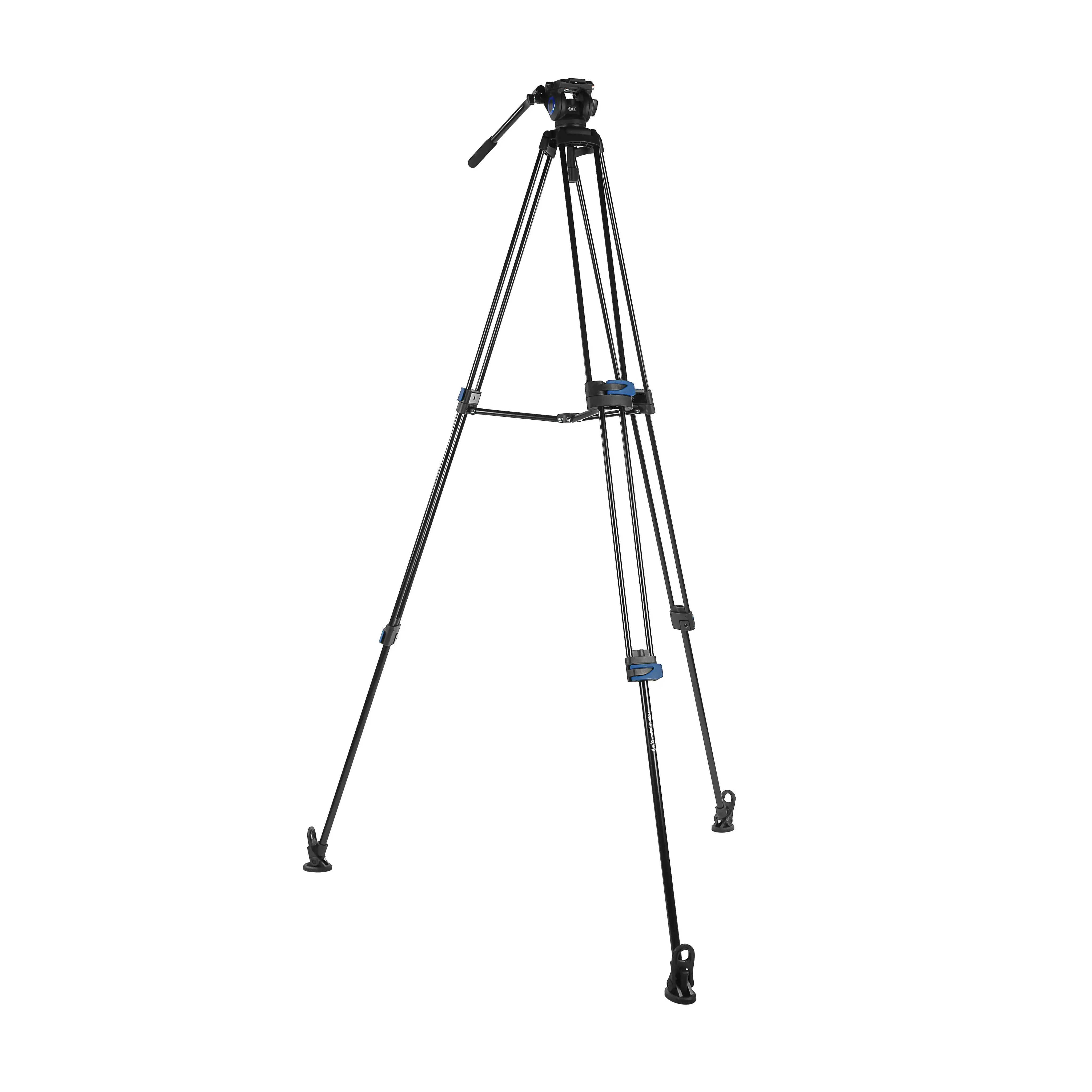 Алюминиевый трипод штатива представляет собой 3-секционную рамочную конструкцию с ногами из легких трубок ?20 и 14 мм. Секции опор независимо выдвигаются и фиксируются клипсовыми зажимами, что дает возможность устанавливать штатив на неровной поверхности. Нижние секции опор оканчиваются шипами, на которые надеваются резиновые опоры для контакта с поверхностью. Опоры-башмаки обеспечивают устойчивое сцепление с гладким полом, а шипы – с грунтом. Высота штатива регулируется от 90 до 184 см, в сложенном виде длина штатива – 91 см.