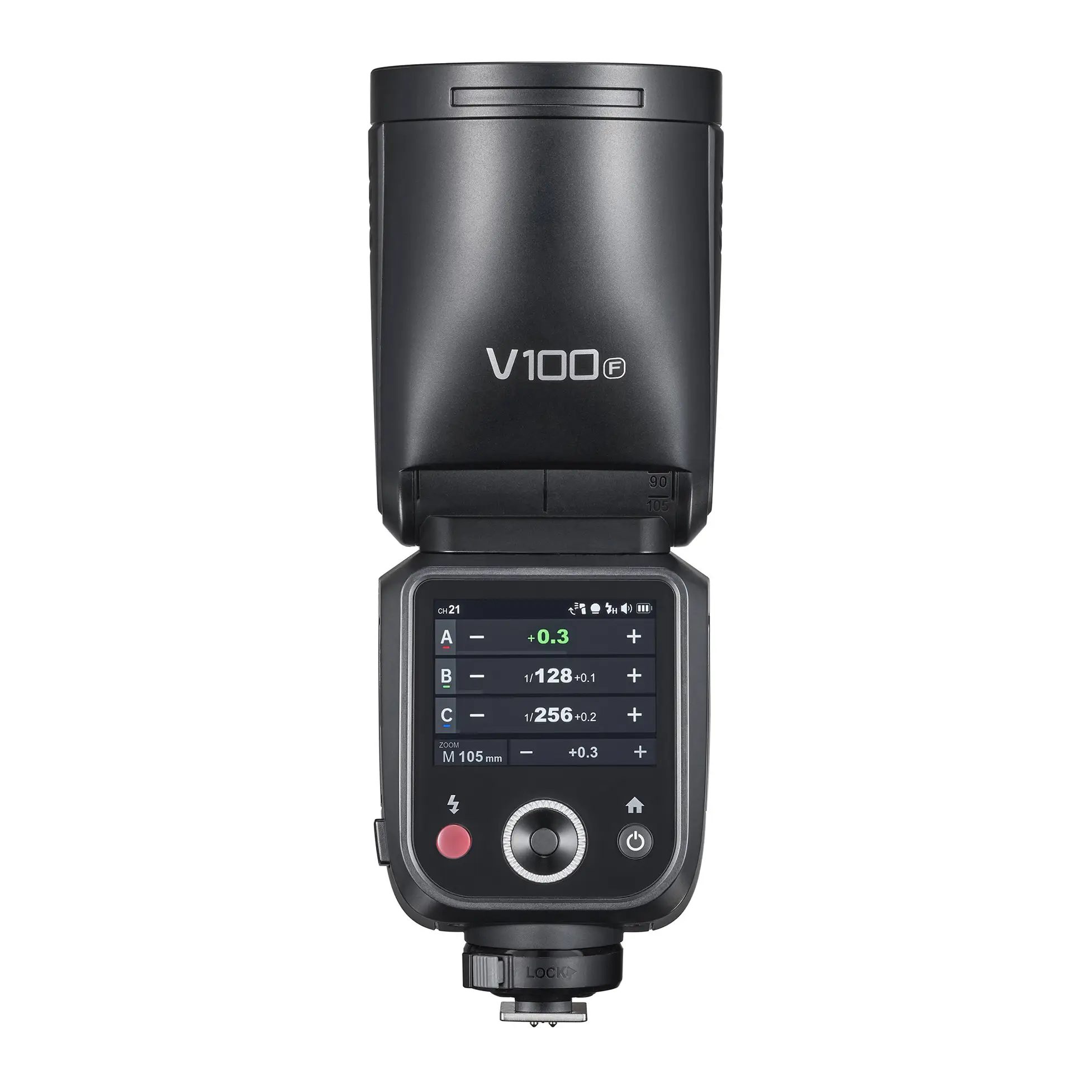 Интерфейс вспышки V100 характеризуется высокой отзывчивостью благодаря наличию большого 2,3-дюймового цветного сенсорного экрана с высоким уровнем чувствительности.